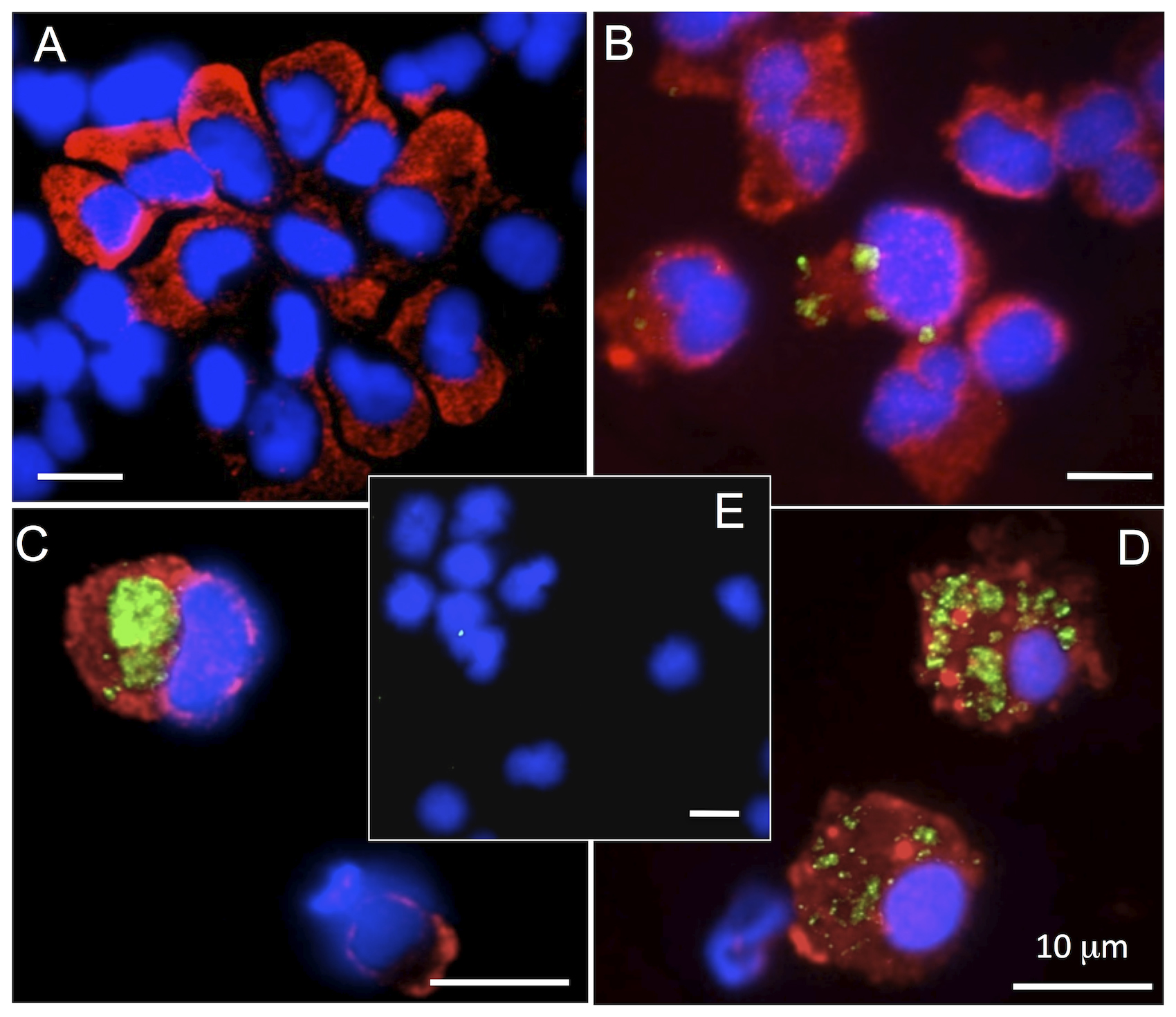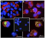 Figure 6. Visualization by immunofluorescence of infected peritoneal monocytic leukocytes from asymptomatic FV3 infected adult frogs following bacterial stimulation.