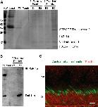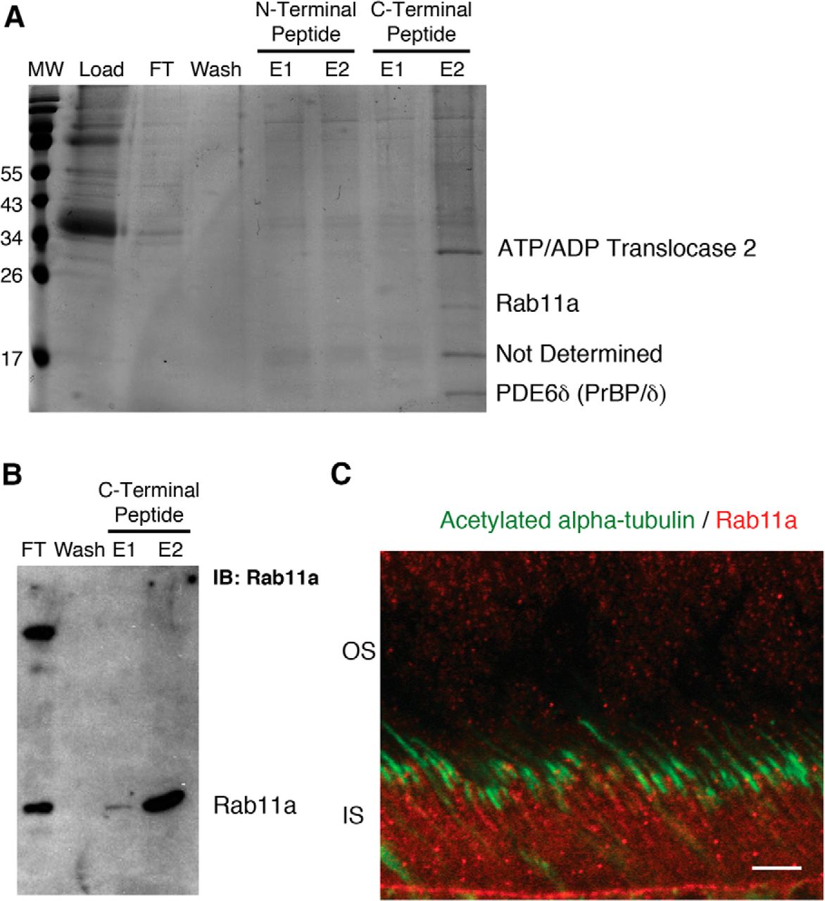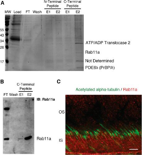 Figure 1. Rab11a binds to the C terminus of rhodopsin. A, Affinity chromatography followed by SDS-PAGE identified four small proteins binding to the C terminus of rhodopsin. Three of the four proteins eluted by the C-terminal peptide were identified by mass spectroscopy: ant2, rab11a, and PDE6δ. B, Western blot confirms that rab11a is pulled down by the C terminus of rhodopsin. C, Immunohistochemistry of rab11a in mouse retina shows a punctate distribution in the inner segment with some faint punctate staining in the outer segment. Green, Acetylated α-tubulin; red, rab11a; IB, immunoblot. Scale bar, 10 μm. |