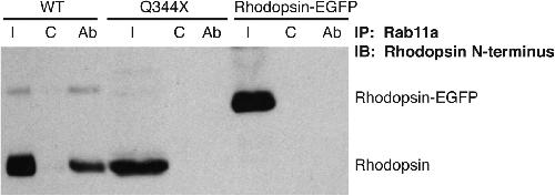 Figure 2. Rab11a binding is dependent on the integrity of the C terminus of rhodopsin. Pull-down experiments using a rab11a antibody show that wild-type rhodopsin can be pulled down by rab11a from retinal extracts but not Q344X or rhodopsin-EGFP. I, Input; C, control IgG antibody wash; Ab, rab11 polyclonal antibody eluate; IP, immunoprecipitation; IB, immunoblot. |