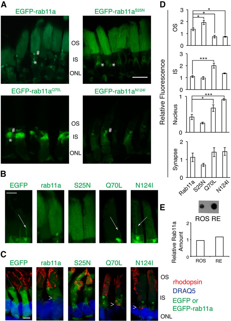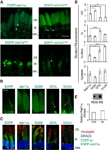 Figure 5. Subcellular localization of EGFP-rab11a and mutants in transgenic X. laevis frog photoreceptors. A, Representative images of EGFP-tagged rab11a variants in X. laevis photoreceptors. EGFP-rab11a is present diffusely in the outer segment, as is the S25N mutant. The Q70L and N124I variants primarily localize in the inner segment. #, Putative recycling endosome localization; *, Golgi cells. Scale bar, 10 μm. B, Outer segment distributions of the rab11a constructs and soluble EGFP. Images were taken with higher-intensity settings to highlight the axoneme. EGFP, rab11aQ70L, and rab11aN124I are all present in an axonemal distribution. C, Rhodopsin staining among tadpoles expressing EGFP or EGFP-tagged rab11a constructs. Arrowheads indicate staining in the inner segment. D, The relative fluorescence of each mutant for the OS, IS, nucleus, and synapse was compared with that of EGFP-rab11a (n = 5â9 per mutant). The OS fluorescent signal was significantly increased for the S25N mutant and significantly decreased for the Q70L and N124I mutants (one-way ANOVA: F(3,22) = 18.34, p < 0.001; Tukey's HSD test: for S25N, p = 0.023; for Q70L, p = 0.018; for N124I, p = 0.026). The IS fluorescent signal was significantly increased for the Q70L mutant relative to rab11a (one-way ANOVA F(3,22) = 12.59, p < 0.001; Tukey's HSD test, p < 0.001). The nuclear fluorescent signal was significantly increased for the Q70L and N124I mutants relative to rab11a (F(3,22) = 21.40, p < 0.001; Tukey's HSD test: for Q70L, p = 0.04; for N124I, p < 0.001). No significant differences in synapse fluorescent signal were observed (F(3,22) = 3.20, p = 0.043; but for all Tukey's HSD test comparisons, p > 0.05). *p < 0.05, **p < 0.01, ***p < 0.001. Error bars represent the SEM. E, Dot blots showing the relative content of rab11a in mouse ROS preparation versus total retinal extract (RE). Green, EGFP; red, rhodopsin; blue, DRAQ5. |