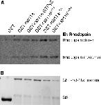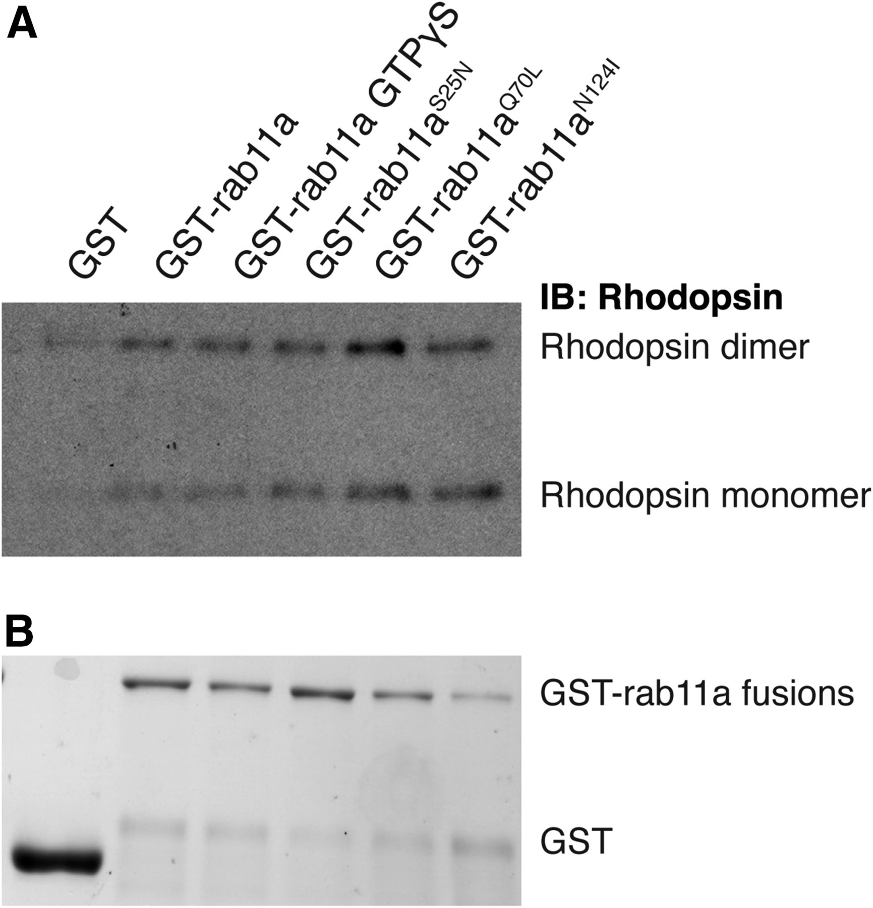 Figure 4. Rab11a binds rhodopsin directly and independently of nucleotide binding status. GST fusions of rab11a and mutants were assayed for their ability to pull down purified native rhodopsin. All rab11a mutants tested were bound to purified rhodopsin. Across repeated experiments, no rab11a mutant had an increased or decreased affinity for rhodopsin relative to wild-type rab11a. A, Western blot of purified rhodopsin pull-down experiments. B, Coomassie gel of purified GST–rab11a fusions. IB, immunoblot. |