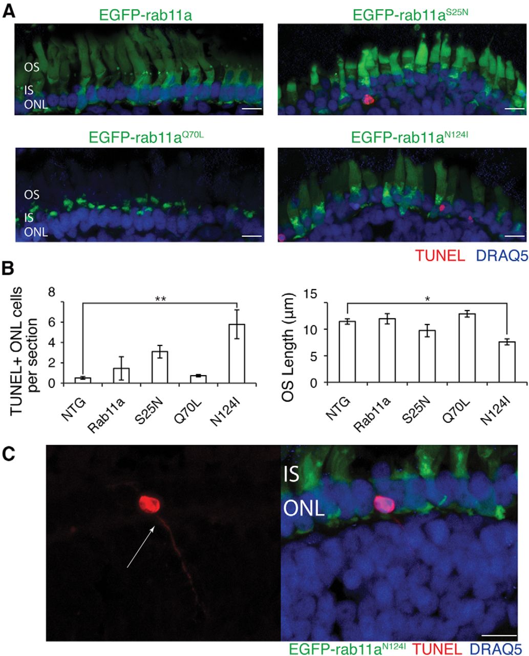 Figure 6. Quantification of TUNEL staining and OS length among the rab11a constructs. EGFP-rab11a-expressing tadpoles and nontrangenic controls (data not shown) were stained for TUNEL, to detect dying cells, and with WGA (data not shown), to measure outer segment length. A, Representative images of EGFP-rab11a tadpole sections stained for TUNEL. B, EGFP-rab11aN124I-expressing tadpoles had a significant increase in TUNEL-positive cells per section (n = 5 per group; one-way ANOVA: F(4,20) = 6.383, p = 0.002; Tukey's HSD test: for N124I compared with nontransgenic animals, p = 0.003; for all other comparisons to nontransgenic animals, p > 0.05). These animals also had significantly decreased OS length relative to nontransgenic controls (n = 6â8 per group; one-way ANOVA: F(4,29) = 6.01, p = 0.001; Tukey's HSD test: for N124I, p = 0.035; for all other comparisons to nontransgenic animals, p > 0.05). *p < 0.05, **p < 0.01. C, TUNEL-positive processes (arrow) projecting from the ONL into the inner retina were observed in EGFP-rab11aN124I-expressing tadpoles. Although TUNEL-positive processes from inner retinal cells could be observed in all transgenic animals and nontransgenic controls, the only TUNEL-positive processes extending from nuclei in the ONL were found in those animals expressing EGFP-rab11aN124I. Green, EGFP; red, TUNEL; blue, DRAQ5. Error bars represent the SEM. Arrows depict regions in the inner segment putatively containing Golgi apparatus. Scale bar, 10 μm. |