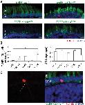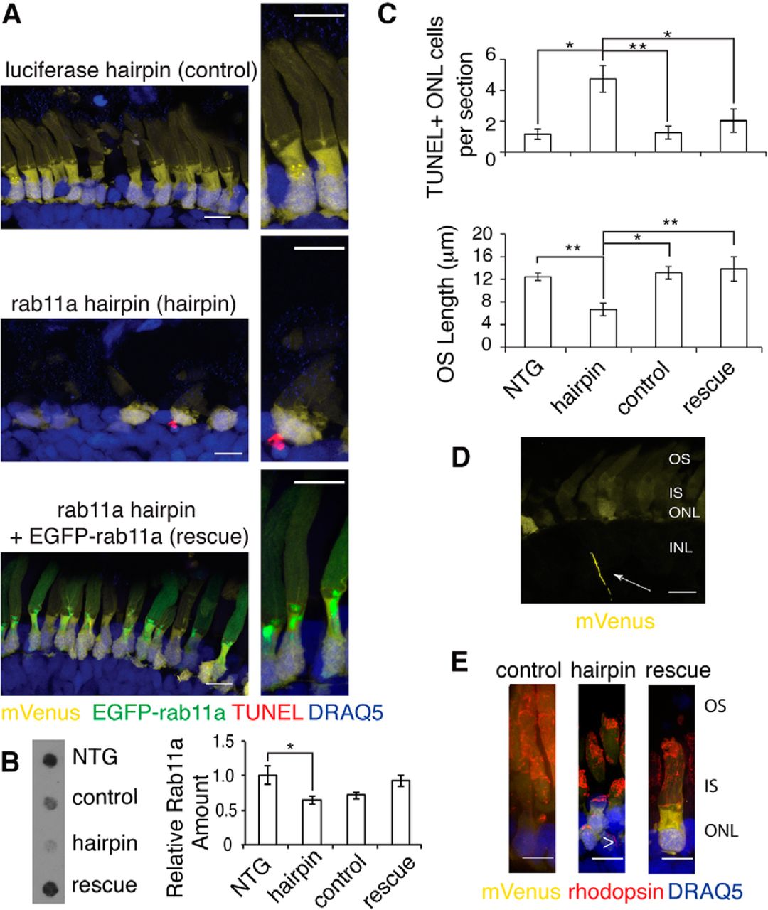 Figure 7. Expression of hairpin against rab11a leads to ectopic process formation, reduction in outer segment length, and increased photoreceptor death. A, Representative images of tadpoles expressing various constructs. Yellow, mVenus; green, EGFP-rab11a; red, TUNEL; blue, DRAQ5. B, Representative dot blots from whole tadpole eye showing rab11a expression changes with hairpin expression. Expression was normalized to tubulin (data not shown). Hairpin-expressing tadpoles had a significant 35.5% reduction in total eye rab11a (n = 5â8 per group; one-way ANOVA, F(3,22) = 4.038, p = 0.02; Tukey' HSD test for nontransgenic versus hairpin, p = 0.038. C, Quantification of TUNEL-positive cells and OS length. Rods expressing a hairpin against firefly luciferase had normal morphology. Rods expressing a hairpin against rab11a had shorter outer segments and significantly increased numbers of TUNEL-positive cells per section. Coexpression of EGFP-rab11a resistant to the hairpin rescued the effects. TUNEL-positive cells (n = 8â14 per group; one-way ANOVA, F(3,39) = 6.031, p = 0.002; Tukey's HSD test: for rab11a hairpin versus nontransgenic animals, p = 0.001; for rab11a hairpin versus luciferase hairpin, p = 0.009; for rab11a hairpin versus rescue, p = 0.048; all other comparisons, p > 0.05). OS length (n = 6â14 per group): one-way ANOVA: F(3,34) = 6.858, p = 0.001; Tukey's HSD test: for rab11a hairpin versus nontransgenic animals, p = 0.006; for rab11a hairpin versus luciferase hairpin, p = 0.017; for rab11a hairpin versus rescue, p = 0.002; all other comparisons, p > 0.05. D, TUNEL-positive processes (arrow) projecting from the ONL into the inner retina were observed in rab11a hairpin-expressing tadpoles. Yellow, mVenus. E, Rhodopsin staining of tadpoles expressing hairpin constructs. Arrowheads indicate inner segment or nuclear layer staining of rhodopsin. Yellow, mVenus; red, rhodopsin; blue, DRAQ5. Scale bars, 10 μm. *p < 0.05, **p < 0.01, ***p < 0.001. |