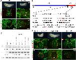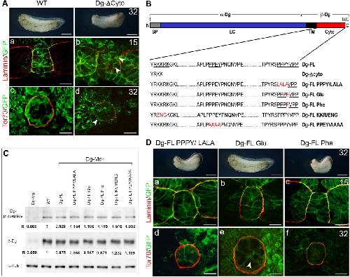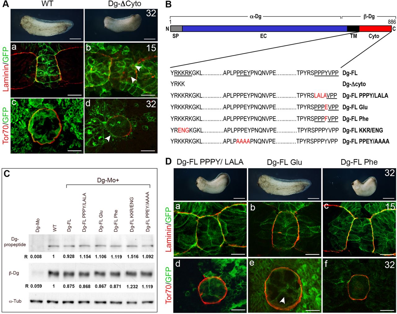 Fig. 4. Dystroglycan mutants lacking the cytoplasmic domain (Dg-δcyto) and the tyrosine residue of the PPPY motif affect vacuolation. (A) Whole embryos are shown for wild-type (WT) and Dg-δcyto mutants at stage 32. (a,b) Stage 15 and (c,d) stage 32. Immunodetection of laminin or the Tor70 antibody in controls (a,c), in Dg-δcyto mutants (b) and in replacement of Dg with Dg-δcyto mutants (d). In mutants, cells are round instead of exhibiting a fusiform phenotype (b, arrowheads). Laminin is detected. Tor70 staining reveals a discontinuous sheath (d, arrowhead). (B) Schematic representation of Dg cytoplasmic mutants. Dg-δcyto encodes a protein that does not possess the C-terminus tail. Four amino acids after the transmembrane domain are conserved to ensure that the Dg-δcyto integrates into the membrane. Dg-FL PPPY/LALA encodes a protein in which the PPPY motif is mutated to LALA. Dg-FL Glu and Dg-FL Phe encode proteins in which the tyrosine residue is mutated to glutamate and phenylalanine, respectively. The Dg-FL KKR/ENG encodes a protein in which the KKR motif is mutated to ENG. The Dg-FL PPEY/AAAA mutant encodes a protein in which the PPEY motif is mutated to AAAA. Underlining indicates consensus binding sequences. (C) Dg-MO was co-injected with mRNAs encoding the Dg mutants. At stage 32, protein lysates were subjected to western blotting using antibodies against β-Dg and α-tubulin. Equivalent amounts of propeptides, endogenous Dg (WT), full-length Dg (Dg-FL) and the mutated β-Dg proteins are observed. R, ratios of Dg-propeptide and β-Dg to α-tubulin normalized to WT. (D) Whole embryos are shown for point mutants at stage 32 in upper panels. Overexpression of Dg-FL PPPY/LALA (a), Dg-FL Glu (b) and Dg-FL Phe (c) proteins on sections at stage 15. Replacement of Dg with Dg-FL PPPY/LALA (d), Dg-FL Glu (e) and Dg-FL Phe (f) on sections at stage 32. Immunodetection of laminin (a-c) and the Tor70 antibody (d-f). The arrowhead in e points to a vacuole. Scale bars: 500â