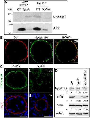 Fig. 6. Myosin IIA is a Dg partner in notochord. (A) Immunoprecipitation (IPP) using an antibody against β-Dg. The precipitate and supernatant of wild-type (WT) and Dg-MO-injected notochords were subjected to western blotting with antibodies against myosin IIA and β-Dg. (B) Identification of Dg and myosin IIA localization using immunofluorescence confocal microscopy. Colocalization of Dg and myosin IIA is observed at cell cortices at stage 28 in WT embryos. (C) Immunodetection of myosin IIA (a,b) and Tor70 proteins (c,d) in C-MO and Dg-MO notochords. Labeling of myosin IIA was lost in Dg morphants at stage 32. Nuclei are stained with Hoechst (blue). (D) Protein extracts of WT, Dg-MO and myosin IIA-MO embryos were subjected to western blotting with antibodies against myosin IIA, actin and α-tubulin (6% SDS-PAGE) and with an antibody against β-Dg (12% SDS-PAGE). In Dg-MO extracts, Dg expression was strongly decreased, whereas the amount of myosin IIA was comparable to that of controls. Note that the decrease in Dg and myosin is not accompanied by a decrease in α-tubulin (α-Tub) or actin. R, ratios of myosin IIA, β-Dg and actin to α-tubulin normalized to WT. Scale bars: 25â