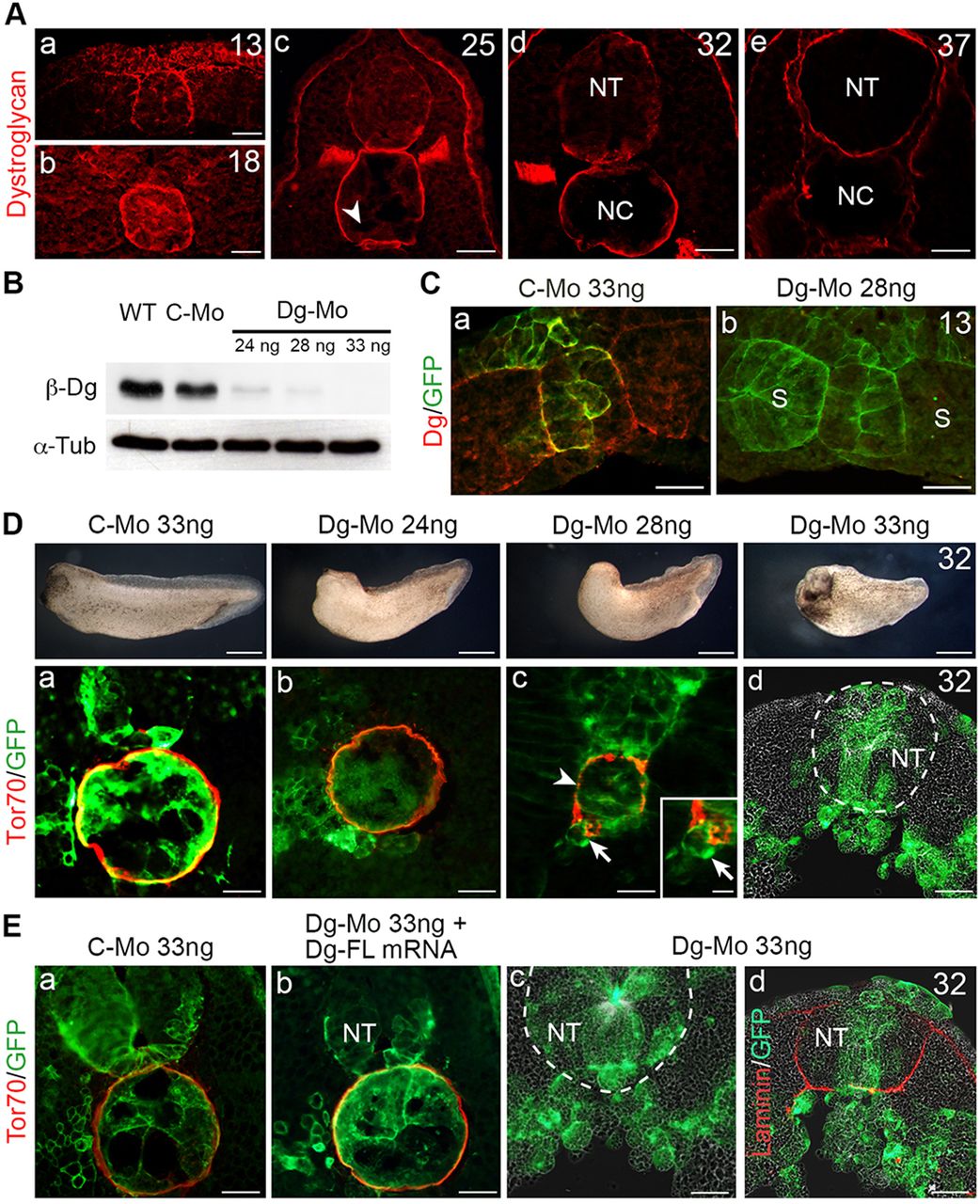 Fig. 1. Dystroglycan depletion affects notochord morphogenesis. (A) Immunodetection of Dg on transverse cryosections from stage 13 to 37 (indicated in the top right of the images). The arrowhead in c indicates a vacuole. (B) Immunoblot of protein extracts from wild-type (WT) embryos or embryos injected with a 5-mispair control morpholino (C-MO) or Dg-MO. (C) Cryosections of embryos co-injected with ras-GFP mRNAs and C-MO (a) or with Dg-MO (b) and then immunostained with antibodies against Dg. In Dg morphants, the Dg staining is lost. (D) The top panels show the embryo phenotypes observed with C-MO or an increasing amount of Dg-MO at stage 32. (a-d) Cryosections treated with Tor70 antibodies showing a dose-dependent effect on the notochord. The arrowhead in c indicates the discontinuity in the notochord sheath. A cell containing Dg-MO (labeled with GFP, arrow and inset in c) escaped from the notochord. (d) At a high amount of Dg-MO, the sheath disappears and the characteristic structure of the notochord is lost. Dotted lines outline the neural tube (NT). (E) Notochord morphogenesis is rescued in Dg morphants through injections of mRNA encoding Dg (Dg-FL mRNA). Dotted lines outline the NT. NC, notochord; S, somite. Scale bars: 25â