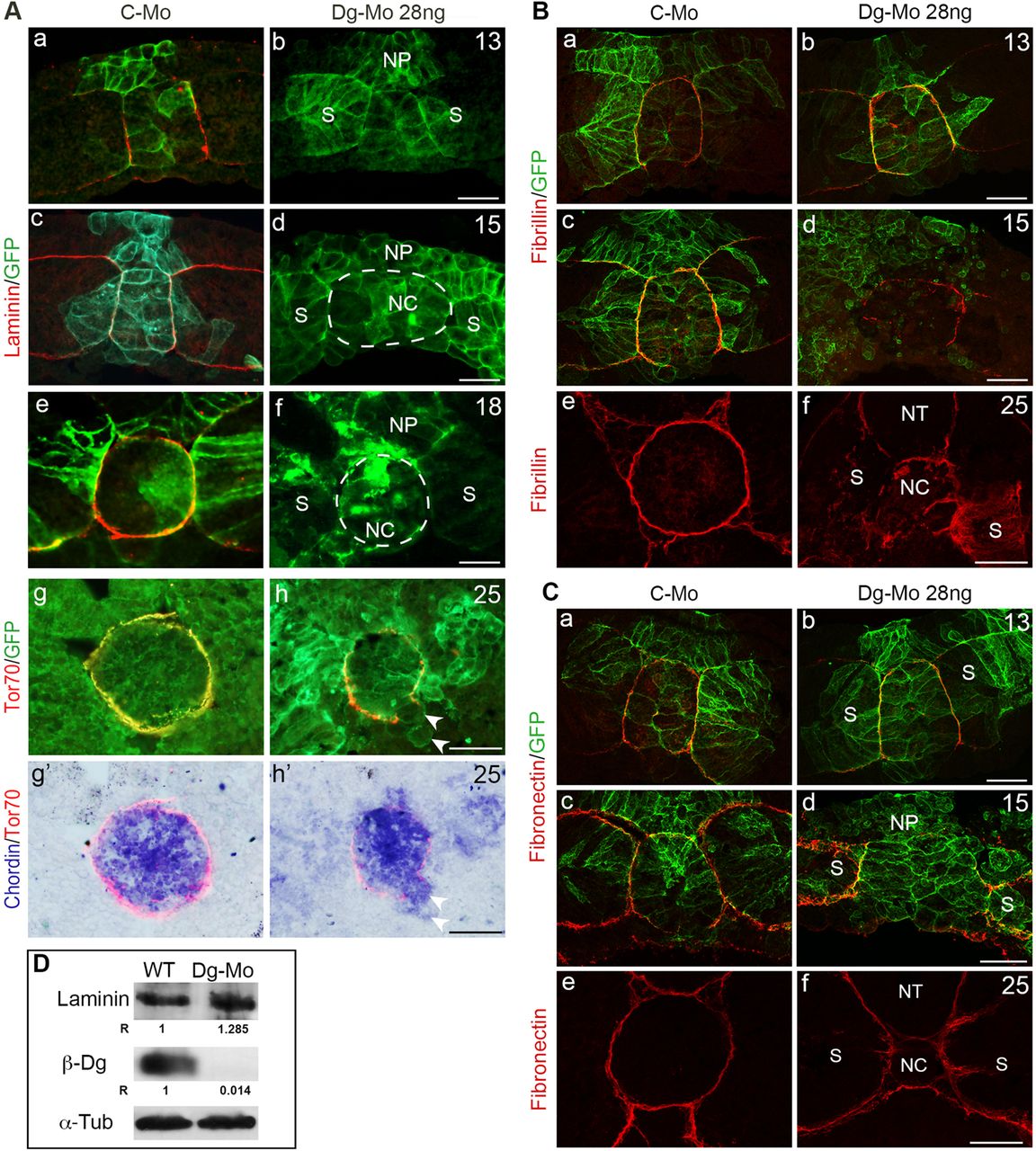 Fig. 2. Dystroglycan depletion affects laminin distribution and notochord morphogenesis. (A) Embryos were co-injected with ras-GFP mRNAs and C-MO or Dg-MO. Immunodetection of laminin or using the Tor70 antibody at stage 13 through to stage 25 (indicated at the top right of the images). (a-h) In Dg morphants, laminin is absent around the notochord (NC). Dotted lines outline the notochord. (gâ²,hâ²) In situ hybridization for chordin and immunodetection using Tor70 were combined at stage 25. Laminin remains absent, and the notochord shape is affected. Arrowheads in h and hâ² point to two chordin-positive cells (blue in hâ²) that were depleted of Dg (green in h) and had not integrated in the notochord. (B,C) Embryos were co-injected with ras-GFP mRNAs with C-MO or Dg-MO. Immunodetection of fibrillin (B) and fibronectin (C) at stages 13, 15 and 25. These components of the extracellular matrix are detected in Dg morphants. (D) Immunoblot of protein extracts of wild-type (WT) or Dg-MO embryos (stage 25). In Dg-MO protein extract, Dg is undetected and the amount of laminin is comparable to that of WT. NC, notochord; NP, neural plate; S, somite; R, ratios of laminin and β-Dg to α-tubulin normalized against that of WT are shown under each lane. Scale bars: 25â