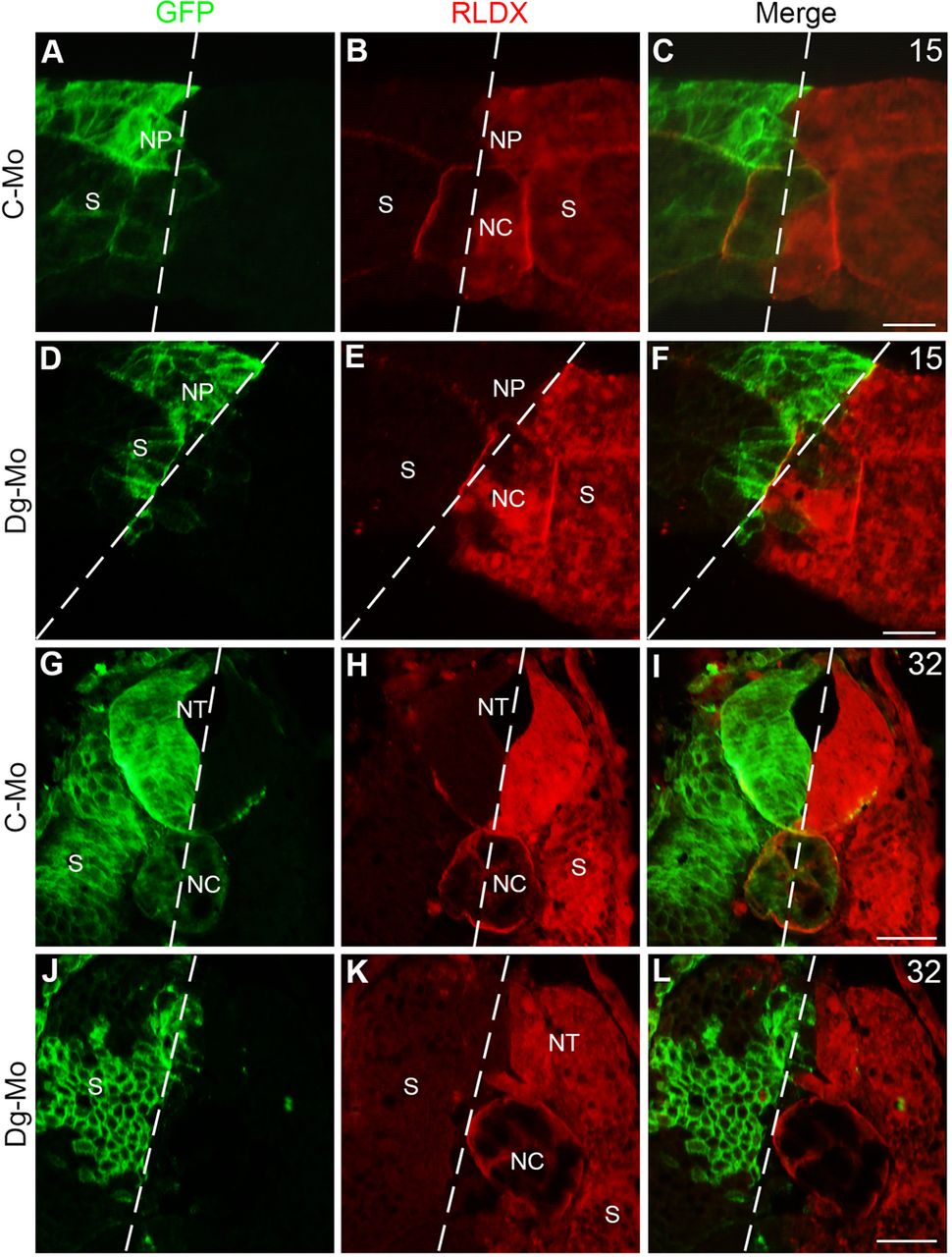 ng) and ras-GFP mRNAs, the two right blastomeres were injected with RLDx as internal controls. Transverse sections at stages 15 (A-F) and 32 (G-L) are shown. (A-C,G-I) Controls. Notochordal cells containing C-MO (green) or RLDx (red) are implicated equally in notochord formation. The axis of symmetry is indicated by the dotted lines. (D-F,J-L) Dg-MO cells (green) are not integrated into the notochord. NC, notochord; NT, neural tube; S, somite. Scale bars: 25â