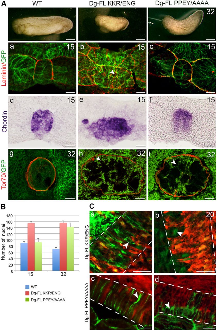 Fig. 5. Mutations in the KKR or PPEY motif result in an enlarged notochord with many vacuoles. (A) Whole embryos are shown for the point mutants at stage 32. Immunodetection of laminin (a-c) and with the Tor70 antibody (g-i) at the stages indicated in the top right. The arrowhead in b points the laminin (red) present around the cell. Arrowheads in h and i indicate numerous vacuoles. (d-f) In situ hybridization for the chordin gene. (B) Histogram showing the number of Hoechst-stained nuclei in ten transverse sections in the truncal part of wild-type and mutant embryos at stages 15 and 32. Results are means from five independent experiments. (C) Frontal sections of mutants at the level of the notochord. Four-cell-stage embryos were injected with ras-GFP mRNA alone (control; green), or with ras-GFP mRNA and mutant mRNAs into the right blastomeres. RLDx (red) was injected into the left blastomeres. In controls (a,c), red and green cells periodically intercalate and extend along the notochord width (arrowheads in a,c). In mutants, the regular succession of ras-GFP cells (green, arrowheads in b,d) and RLDx cells (red) is lost. Dashed lines outline the notochord. Scale bars: 500â