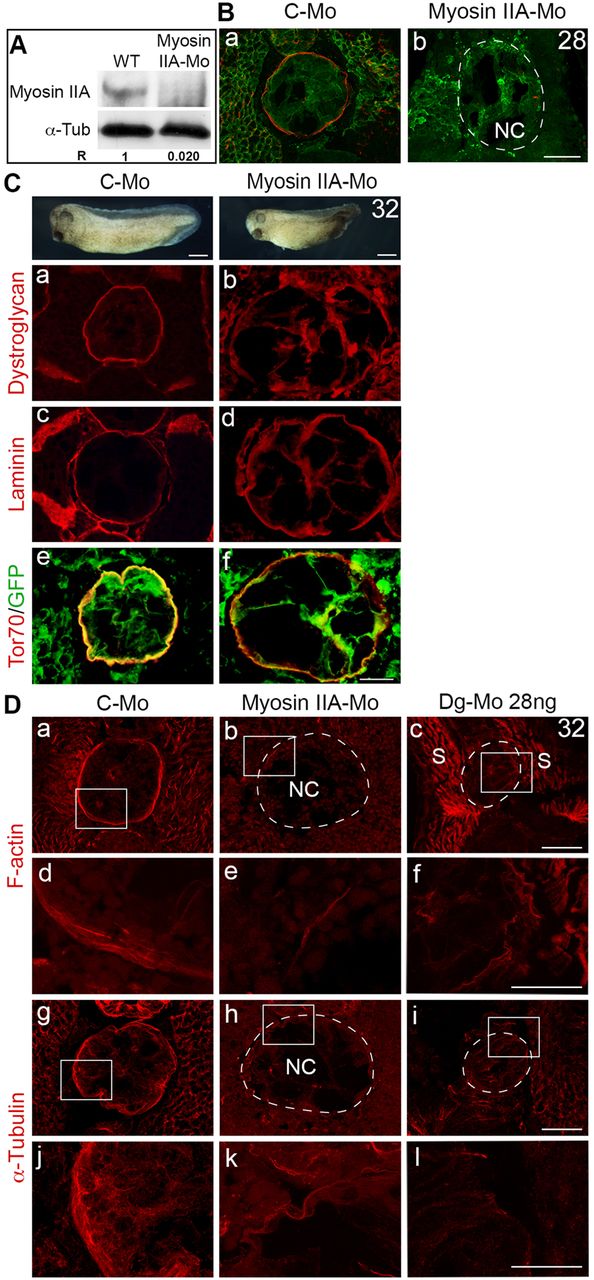 Fig. 7. Myosin IIA is required for cytoskeletal integrity. (A) Protein extracts of wild-type (WT) or myosin IIA-MO embryos were subjected to western blotting with antibodies against myosin IIA and α-tubulin, which showed the efficiency of the morpholinos. R, ratios of myosin IIA to α-tubulin normalized to WT. (B) Immunodetection of myosin IIA in C-MO and myosin IIA-MO notochords. Labeling of myosin IIA was lost in morphants at stage 28. Dotted lines outline the notochord (NC). (C) Phenotypes of control and myosin IIA morphants at stage 32. (a-d) Immunodetection of Dg and laminin in C-MO embryos and morphants. The notochord diameter and the vacuole size increased. Myosin IIA depletion does not affect Dg and laminin expression, but they do not localize normally. (e,f) Tor70 labeling confirms the increase in the size of the notochord and vacuoles. (D) F-actin and α-tubulin localization, by using confocal microscopy, in control and myosin IIA- and Dg-depleted notochord at stage 32. (a-f) F-actin is revealed by staining with phalloidin. (d-f) Magnification at the cell cortex showing the loss of labeling in morphants; the area corresponds to that highlighted by the white box in the panel above. (g-l) Tubulin is revealed by using an antibody against α-tubulin. (j-l) Magnification at the cell cortex showing the network disruption of α-tubulin; the area corresponds to that highlighted by the white box in the panel above. Dotted lines outline the notochord. S, somite. Scale bars: 25â