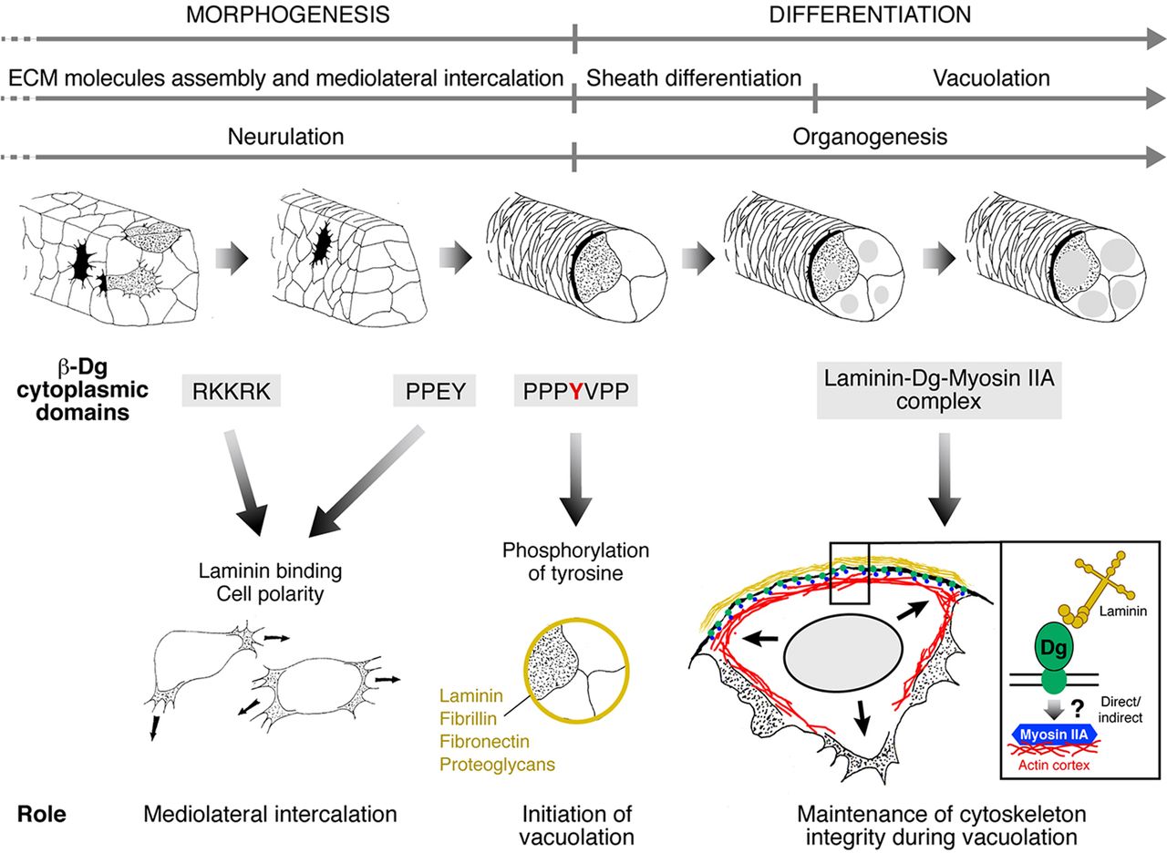 Fig. 8. The Dg adhesome is involved throughout notochord morphogenesis. The data have established that, when Dg binds to laminin, the RKKRK and PPEY sites of the cytoplasmic domain are mobilized to ensure cell polarity and mediolateral intercalation. Laminin-Dg interactions lead to phosphorylation of the tyrosine residue in the PPPYVPP site to generate a signaling pathway that allows vacuole differentiation. Finally, an adhesome comprising laminin-Dg-myosin-IIA-actin is established to maintain cortical integrity during vacuolation. The sheath is shown in yellow. (Adapted from Keller et al., 1989.)
