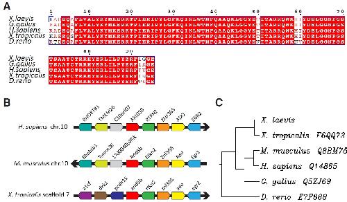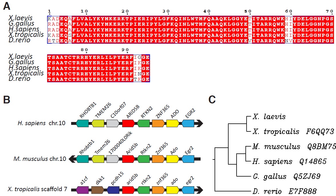 Fig. 1. Characterization of a X. laevis ortholog of arid5b. (A) Predicted ARID domain amino acid sequence comparison: G. gallus (ac Q5ZJ69); H. sapiens (ac Q14865); X. tropicalis (F6QQ73); D. rerio (E7F888). (B) Synteny blocks containing arid5b genes in H. sapiens; M. musculus and X. tropicalis genomes. Genes organization in the human arid5b gene region was used as basis for comparison. Chromosomal localization is indicated. The scaffold number is given for X. tropicalis. Relative spacing between the genes is not shown. (C) Phylogenetic tree of arid5b genes from various vertebrate species constructed using the neighbour-joining method. Accession numbers used are shown.