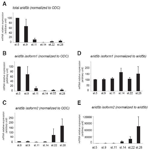 isoforms (total arid5b) (A), isoform1 (B,D) or isoform2 (C,E). The relative quantities of mRNA were determined with ODC (A,B,C) or total arid5b (D,E)