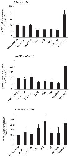 zone (DMZ), ventral marginal zone (VMZ), lateral marginal zone (LMZ) ectoderm and endoderm. Both isoforms are ubiquitously expressed at the early