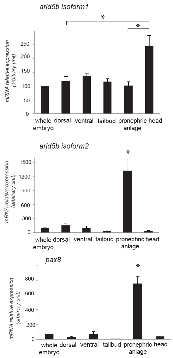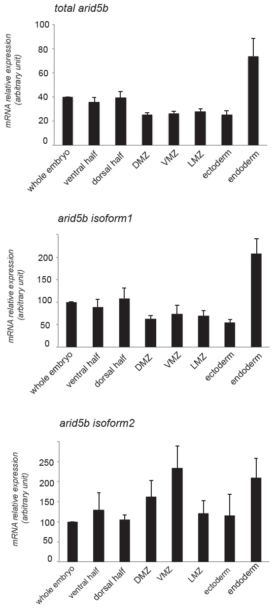Fig. 3 (Right). Expression of arid5b at the early gastrula stage. RT-qPCR analyses for total arid5b, isoform1 and isoform2 were performed on dissected
