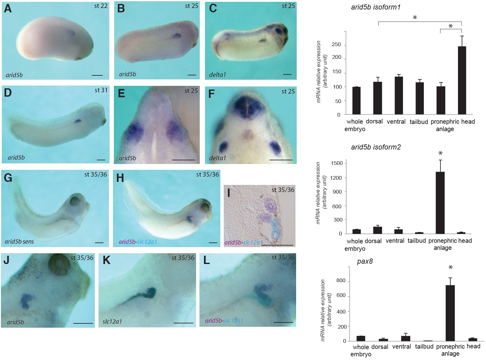 delta1 (C,F), slc12a1 (I,K,L) and with control sense probe for arid5b (G). Lateral views with anterior to the right (A-D,G,H,J-L). Transverse section at