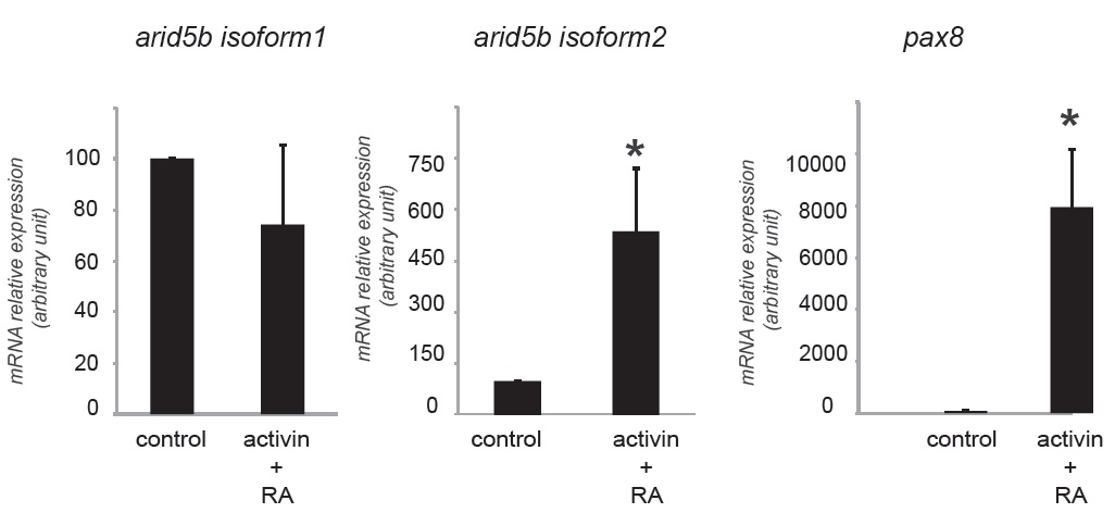 Fig. 6. Arid5b isoform2 is specifically induced in animal caps treated with activin A and RA. RT-qPCR analysis of arid5b isoform1 and isoform2, as well as pax8 expression in induced blastula animal caps. Animal caps were dissected at blastula stage 9, incubated for 3 hours in presence of RA and activin A, or mock solution for the control group. Animal caps were further cultured in 1X MBS for 48h hours and processed for RT-qPCR. A significant increase of isoform2 expression is observed in response to RA and activin A. Average values from three independent experiments. * P<0.05 ** P < 0.005.