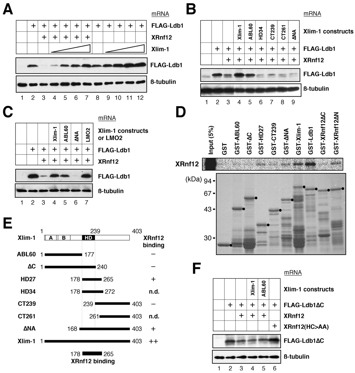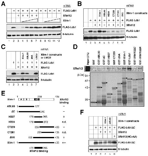 A high level of Xlim-1 suppresses XRnf12-mediated degradation of Ldb1 through interaction with Ldb1. (A) Effects of Xlim-1 on XRnf12-mediated degradation of Ldb1. The experimental design is the same as in Fig. 4A,B. Xlim-1 increases the expression level of FLAG-Ldb1 dose-dependently in the presence (lanes 3-7) or absence (lanes 8-12) of XRnf12. Comparison between lanes 6 and 7, and lanes 11 and 12 suggests that Xlim-1 suppresses Ldb1 degradation by XRnf12. See text for details. Amounts of mRNAs (ng/embryo): FLAG-Ldb1, 0.5; XRnf12, 0.25; Xlim-1, 0.25 (lanes 4,9), 0.5 (lanes 5,10), 1.0 (lanes 6,11), 2.0 (lanes 7,12). (B) The LIM domain-containing fragment (ABL60) of Xlim-1 is sufficient for the suppression of XRnf12-mediated degradation of Ldb1. A series of Xlim-1 constructs depicted in E were tested at the highest dose used in A (lanes 7,12) for their ability to block Ldb1 degradation by XRnf12. ABL60, which contains the LIM domains, efficiently blocks Ldb1 degradation whereas other constructs does not. Amounts of mRNAs (ng/embryo): FLAG-Ldb1, 0.5; XRnf12, 0.25; Xlim-1 constructs, 2.0. (C) LIM-only protein LMO2 also efficiently blocks Ldb1 degradation in a different set of experiments designed as in B. (D) Interactions between 35S-labeled XRnf12 and a series of GST-Xlim-1 constructs depicted in E were analyzed by GST pull-down assay. XRnf12 shows weak interactions with GST-HD27 and GST-ΔNA, while other GST-Xlim-1 constructs shows little or no interaction with XRnf12. GST-Ldb1 shows stronger interaction with XRnf12 than GST-Xlim-1 does. XRnf12 also shows weak self-interaction with GST-XRnf12ΔN (aa 282-616). GST alone serves as a negative control. Coomassie brilliant blue staining (lower panel) shows comparable amounts of GST fusion proteins (indicated by dots) used in the assay. (E) Representation of the GST-Xlim-1 constructs used for mapping experiments and the summary of the results shown in D. The homeodomain-containing region (aa 178-265) of Xlim-1 is necessary and sufficient for the interaction with XRnf12. A, B, LIM domains A and B; HD, homeodomain; n.d., not done; numbers, amino acid positions. (F) The LIM interaction domain of Ldb1 is required for the suppression of XRnf12-mediated Ldb1 degradation by Xlim-1 as revealed by the use of FLAG-Ldb1ΔC. XRnf12 causes degradation of Ldb1ΔC in a RING-dependent manner, which is not suppressed by Xlim-1 or ABL60. To avoid an overlap with a non-specific band, we used anti-Ldb1/CLIM2 (N-18) antibody in F to detect FLAG-Ldb1ΔC instead of anti-FLAG antibody used in the rest of the experiments in Fig. 5. Amounts of mRNAs injected (ng/embryo): FLAG-Ldb1ΔC, 0.5; XRnf12 constructs, 0.5; Xlim-1 constructs, 2.0.