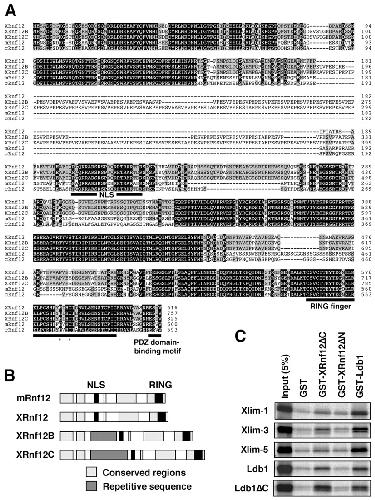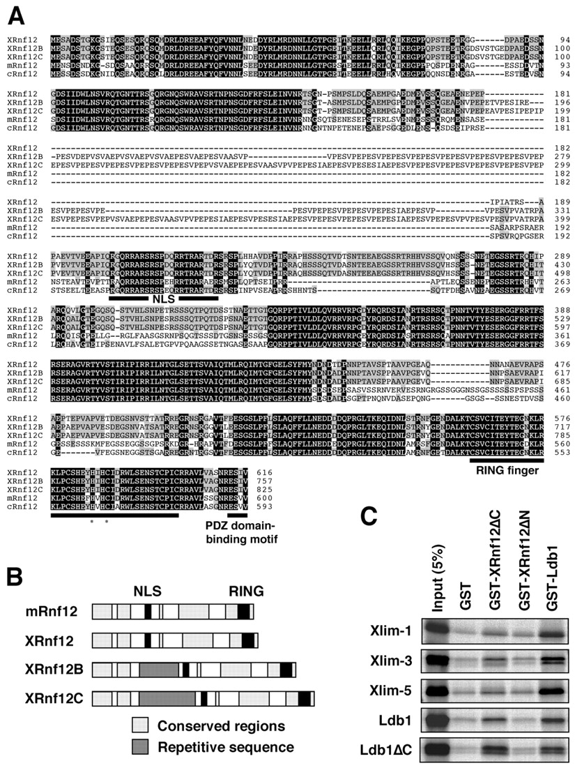 Characterization of XRnf12. (A) Amino acid sequence alignment of XRnf12, XRnf12B, and XRnf12C, as well as mouse and chick Rnf12. Note the repetitive heptamers present in XRnf12B and XRnf12C. A PDZ domain-binding motif is present in the C terminus. NLS, nuclear localization signal; asterisks, sites of mutation in the RING mutant XRnf12(HC>AA). DDBJ Accession Numbers are: XRnf12 (AB114039), XRnf12B (AB114040) and XRnf12C (AB114041). (B) Schematic representation of mRnf12, XRnf12, XRnf12B, and XRnf12C. (C) The N-terminal region (aa 1-283) of XRnf12 interacts with LIM homeodomain proteins and Ldb1. GST pull-down assay was performed with 35S-labeled Xlim-1, Xlim-3, Xlim-5, Ldb1 and Ldb1ΔC. While GST XRnf12ΔC interacts with all of the proteins tested, GST XRnf12ΔN shows little interaction. GST and GST Ldb1 serves as negative and positive controls, respectively.