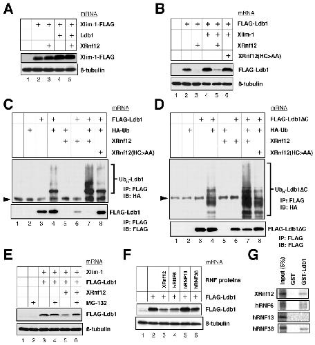 Fig 5. XRnf12 causes ubiquitination and proteasome-dependent degradation of Ldb1 in a RING-dependent manner. (A) XRnf12 does not affect the steady-state level of Xlim-1-FLAG, either in the presence or absence of Ldb1. The indicated mRNAs were injected into the ventral region and the expression levels of the FLAG-tagged proteins were examined at the gastrula stage. Note that the levels of Xlim-1-FLAG are increased in the presence of Ldb1. β-tubulin, loading control. Amounts of mRNAs injected (ng/embryo): Xlim-1-FLAG, 0.25; Ldb1, 0.5; XRnf12, 0.25. (B) XRnf12 decreases the steady-state level of FLAG-Ldb1 both in the presence and absence of Xlim-1 in a RING-dependent manner. Note the increase in the expression level of FLAG-Ldb1 by Xlim-1 co-expression. Amounts of mRNAs (ng/embryo): FLAG-Ldb1, 0.5; Xlim-1, 0.25; XRnf12 constructs, 0.25. (C) XRnf12 enhances ubiquitination of Ldb1. Embryos were injected ventrally with the mRNAs indicated and the cell lysates were immunoprecipitated (IP) with anti-FLAG antibody followed by either anti-FLAG or anti-HA immunoblotting (IB) to detect non-ubiquitinated Ldb1 or ubiquitinated proteins, respectively. Co-expression of XRnf12 results in downregulation of non-ubiquitinated FLAG-Ldb1 expression levels (lower panel). While weak ubiquitination is observed in the absence of XRnf12 (lane 4), strong ladder-like ubiquitination signals appear in the presence of XRnf12 (lane 7). XRnf12(HC>AA) does not enhance ubiquitination (lane 8). Amounts of mRNAs (ng/embryo): FLAG-Ldb1, 2.0; HA-Ub, 1.0; XRnf12 constructs, 1.0. (D) The N-terminal region (aa 1-291) of Ldb1 is sufficient for ubiquitination by XRnf12. By using FLAG-Ldb1ΔC instead of FLAG-Ldb1, smaller-sized ubiquitinated protein bands are detected, confirming that the ubiquitinated proteins in C are indeed Ldb1 and not some other proteins associated with Ldb1. Co-expression of XRnf12 also results in downregulation of non-ubiquitinated FLAG-Ldb1ΔC. The amounts of mRNAs used are the same as in C. Arrowhead indicates the position of IgG. (E) XRnf12 causes proteasome-dependent degradation of Ldb1. After mRNA injection, cells were dispersed and cultured in the presence or absence of MG-132 until the gastrula stage. Decrease of FLAG-Ldb1 levels by XRnf12 (lane 5) is suppressed in the presence of MG-132 (lane 6). MG-132 does not affect the expression of FLAG-Ldb1 (lanes 3,4). Amounts of mRNAs (ng/embryo): FLAG-Ldb1, 0.5; Xlim-1, 0.25; XRnf12, 0.25. (F) The steady-state level of FLAG-Ldb1 is downregulated by hRNF6 and, to a lesser extent, by hRNF38, but not by hRNF13. The experimental design is the same as in A and B. β-tubulin, loading control. Amounts of mRNAs (ng/embryo): FLAG-Ldb1, 0.5; RING finger proteins, 0.5. (G) RING finger proteins that cause reduction in the steady-state level of Ldb1 interact with Ldb1. GST pull-down assay was performed with 35S-labeled XRnf12, hRNF6, hRNF13 and hRNF38. Human RNF13 does not interact with GST-Ldb1, while other RING finger proteins do. GST serves as a negative control.