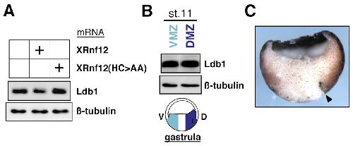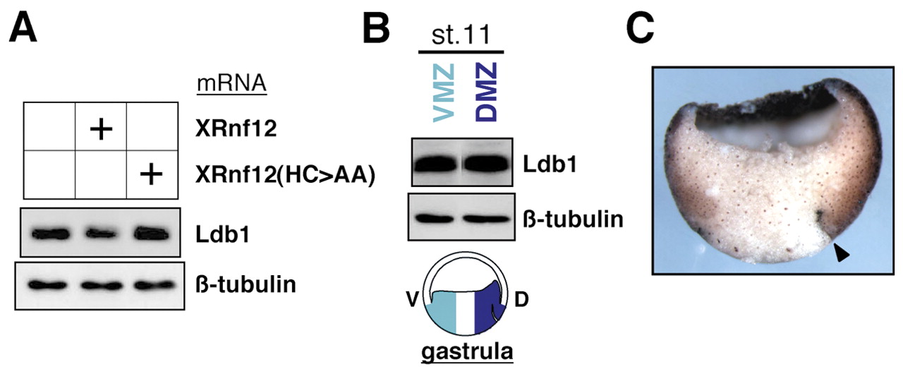 Analysis of endogenous Ldb1 protein levels. (A) XRnf12 downregulates endogenous Ldb1 expression level in a RING-dependent manner. Animal caps were dissected at the blastula stage (stage 8-9) from embryos injected with the mRNAs (2 ng/embryo) indicated, and collected at the gastrula stage (stage 11). Endogenous Ldb1 expression levels were analyzed by western blotting using anti-Ldb1/CLIM2 (N-18) antibody. (B) Ldb1 does not exhibit dorsal-to-ventral (DV) difference in protein expression levels as revealed by western blot analysis. DMZ and VMZ explants dissected at the gastrula stage (stage 11) were compared for Ldb1 expression using anti-Ldb1/CLIM2 (N-18) antibody. (C) Ldb1 is uniformly expressed in the bisected mid gastrula embryo as revealed by immunostaining using anti-Ldb1/NLI antibody. Animal side is to the top, dorsal to the right. Arrowhead indicates blastopore.