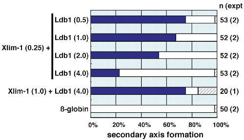 Disturbing Xlim-1/Ldb1 stoichiometry affects their axis inducing activity. Ldb1 dose-dependently suppresses axis duplication by Xlim-1, which is rescued by co-expression of a higher dose (1 ng) of Xlim-1. Embryos injected with the mRNAs indicated were scored for axis development at the tailbud stage as in Fig. 3A. β-globin (2.0 ng/embryo) serves as a negative control. n, total number of injected embryos; expt, number of independent experiments. Amounts of mRNAs injected are indicated in parentheses (ng/embryo).