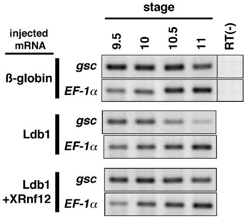 Ldb1 overexpression affects the maintenance phase of gsc expression. Embryos injected dorsally with the mRNAs (4.0 ng/embryo) indicated were collected at stages 9.5, 10, 10.5 and 11 (late blastula to mid gastrula) and the expression of gsc was analyzed by RT-PCR. Downregulation of gsc by Ldb1 overexpression was not prominent at early-gastrula stages (st 9.5, 10) but became prominent after mid gastrula (stage 10.5, 11). Co-expression of XRnf12 restored gsc expression. EF-1α serves as a loading control.