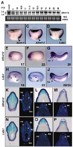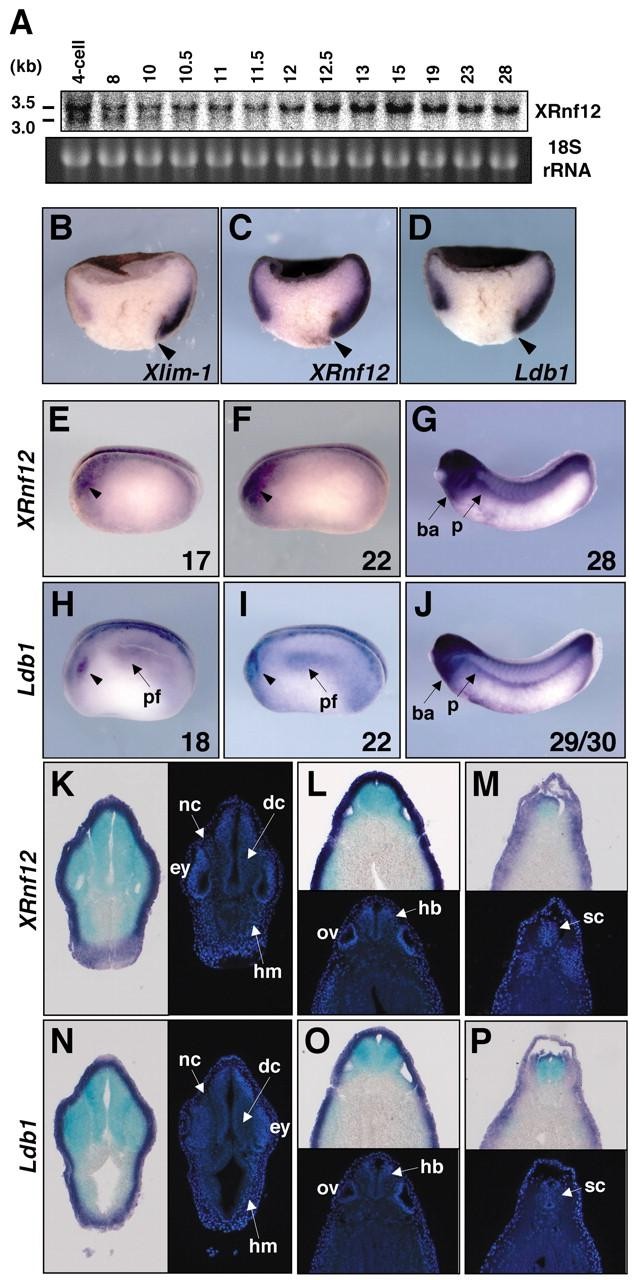 Fig. 2. Temporal and spatial expression patterns of XRnf12. (A) Northern analysis. The 3.5 kb transcript is expressed throughout early embryogenesis, while the 3.0 kb transcript disappears at stage 11. 18S rRNA stained with ethidium bromide served as a loading control. Numbers at the top are developmental stages. (B-D) Overlapping expression of Xlim-1, XRnf12 and Ldb1 in the gastrula mesoderm as revealed by whole-mount in situ hybridization of sagittally bisected gastrula embryos (stage 10.5). Animal side is to the top, dorsal to the right. Arrowhead, blastopore. (E-J) Co-expression of XRnf12 and Ldb1 in neurula and tailbud stage embryos. Dorsal is to the top, anterior to the left. Arrowhead indicates profundal-trigeminal placodal area; numbers in the bottom right of each panel are the developmental stages. (K-P) Co-expression of XRnf12 and Ldb1 as revealed by cross sections of stained tailbud embryos (stage 26). Upper, or left, panels are bright-field images; lower, or right, panels show DAPI staining. XRnf12 (EG,K-M) and Ldb1 (H-J,N-P) are similarly expressed throughout early embryogenesis. Turquoise staining inside of the embryos shown in the cross sections resulted from BCIP staining as NBT was depleted by strong staining in the epidermis. Both genes are expressed similarly in the neural tube along the AP axis. ba, branchial arches; dc, diencephalon; ey, eye; hb, hindbrain; hm, head mesenchyme; nc, neural crest; ov, otic vesicle; p, pronephros; pf, pronephric field; sc, spinal cord.