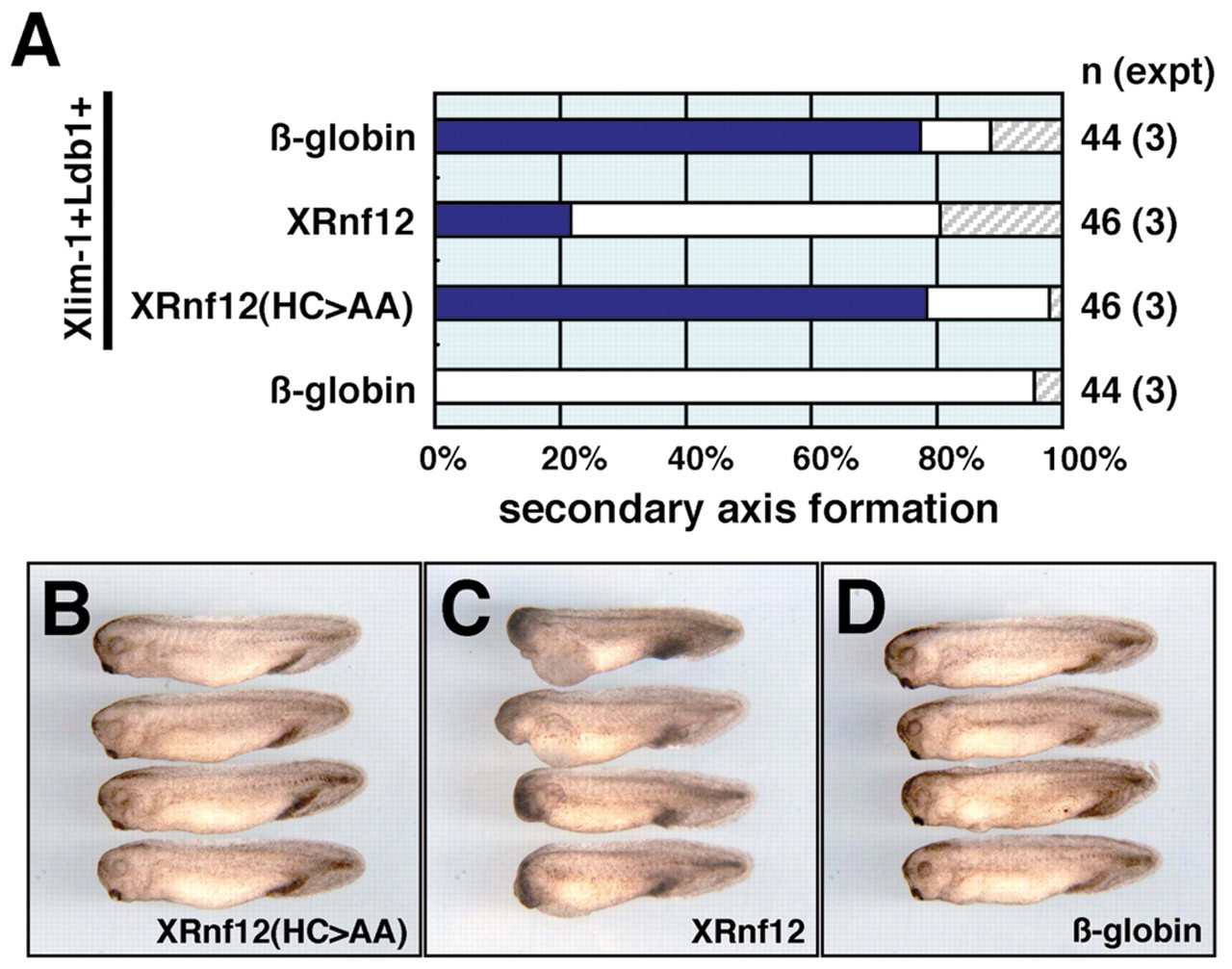 XRnf12 suppresses axis duplication elicited by Xlim-1/Ldb1 and antagonizes head organizer activity in a RING-dependent manner. (A) XRnf12 blocks secondary axis formation elicited by Xlim-1/Ldb1, whereas the RING mutant XRnf12(HC>AA) does not. Embryos injected with the mRNAs indicated were scored for axis development at the tailbud stage and categorized as secondary axis (dark blue bars), normal (white bars), or others (hatched bars).β -globin serves as a negative control. n, total number of injected embryos; expt, number of independent experiments. Amounts of mRNAs injected (ng/embryo): Xlim-1, 0.25; Ldb1, 0.5; XRnf12 constructs, 0.25; β-globin (coinjected), 0.25; β-globin (alone), 1.0. (B-D) Overexpression of XRnf12 in the dorsal marginal zone leads to head defects. While XRnf12(HC>AA) has little or no effect (B), XRnf12 overexpression in the dorsal region results in reduced head structures (C). β-globin has no effect (D). Amounts of mRNAs injected were 2.0 or 4.0 ng/embryo.