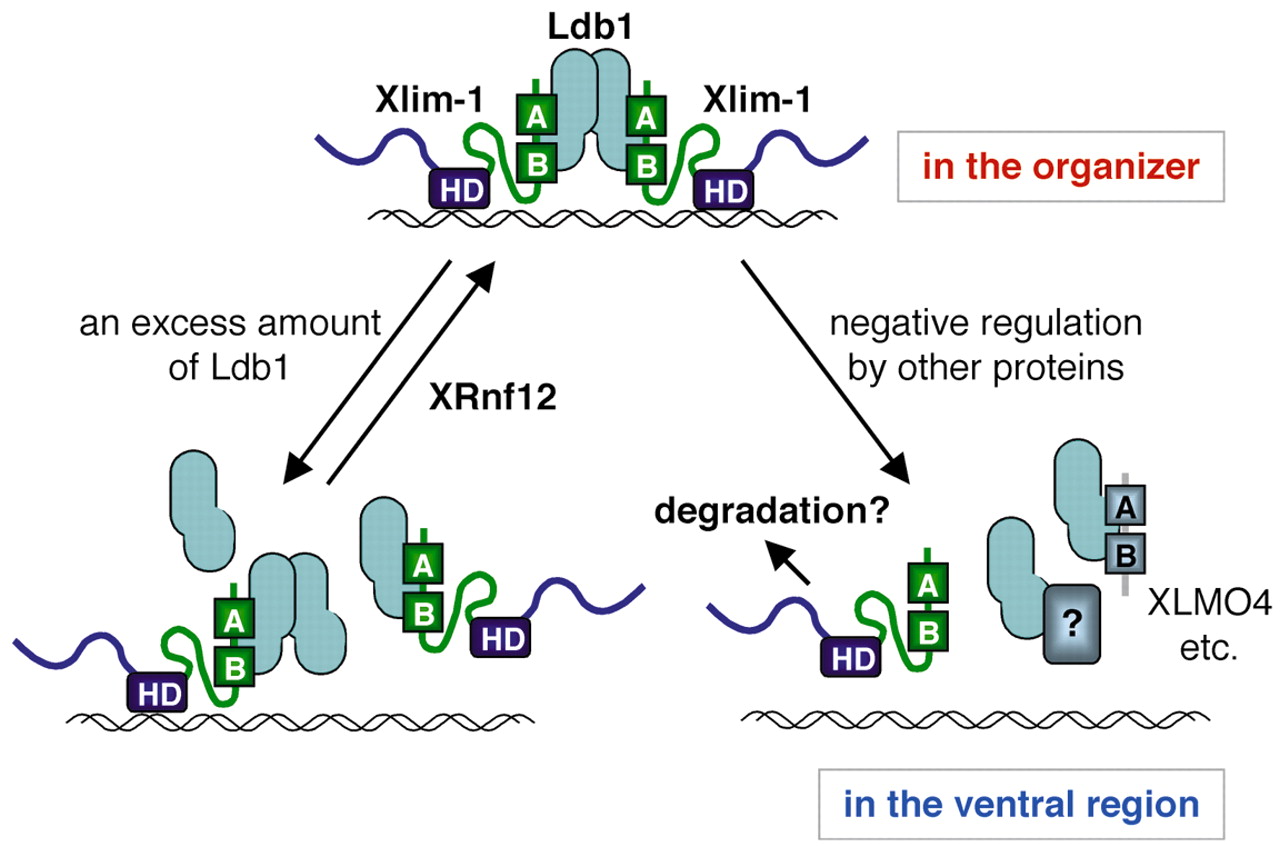 A model for the role of XRnf12 in the establishment of proper Xlim-1/Ldb1 stoichiometry in the Spemann organizer. In the organizer, tetramer formation of Xlim-1/Ldb1 is required for their activity. XRnf12 selectively degrades excess Ldb1 unbound to Xlim-1, which interferes with organizer gene expression presumably by disturbing Xlim-1/Ldb1 tetramer formation. Excess Ldb1 may also possibly interfere with LIM domain-dependent association of Xlim-1 with other proteins. In this way, proper stoichiometry and maximal activity of Xlim-1/Ldb1 is assured in the presence of XRnf12 in the organizer. In the ventrolateral mesoderm, Ldb1 may escape degradation by XRnf12 through interaction with Ldb1-interacting proteins, one of which may be XLMO4 (J. L. Gomez-Skarmeta, personal communication). The putative Ldb1/LMO complex may contribute to complete suppression of Xlim-1/Ldb1 activity in the ventrolateral region, and may participate in a distinct transcriptional regulatory complex. Xlim-1 unbound to Ldb1 may be subject to proteasome-dependent degradation by an unidentified ubiquitin ligase, similar to the case of Drosophila Apterous (Weihe et al., 2001).