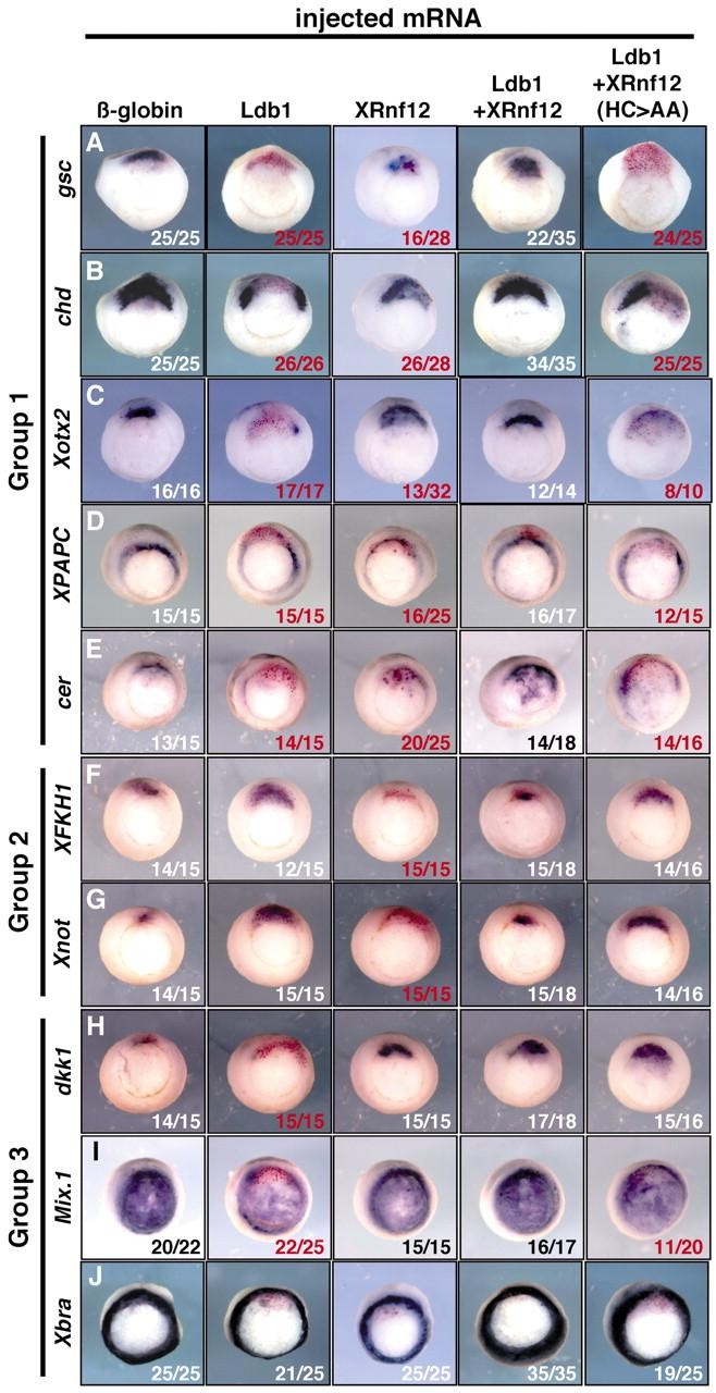 Fig. 8. Effects of Ldb1 or XRnf12 overexpression on organizer gene expression. Embryos injected dorsally with the mRNAs indicated were scored for expression of various marker genes in the organizer as assayed by whole-mount in situ hybridization. Genes categorized in group 1 (A-E, gsc, chd, Xotx2, XPAPC and cer) are downregulated by overexpression of either Ldb1 or XRnf12, whereas genes categorized in group 2 (F,G, XFKH1 and Xnot) are downregulated only by XRnf12, and those in group 3 (H,I, dkk1 and Mix.1) are downregulated only by Ldb1. Xbra (J) is only slightly affected by Ldb1 overexpression. Numbers indicate the frequency of the phenotype observed: numbers in red indicates downregulation, whereas numbers in black or white indicates normal expression. Note that downregulation of gene expression by either Ldb1 or XRnf12 overexpression was restored upon co-expression of both, and that the rescuing effect of XRnf12 co-expression was RING-dependent (except for dkk1, see Discussion). nβ-gal mRNA was coinjected as a lineage tracer, stained in red. Amounts of mRNAs (ng/embryo): nβ-gal, 0.06; β-globin, 4.0; Ldb1, 4.0; XRnf12, 2.0 or 4.0; XRnf12 constructs coinjected with Ldb1, 1.0 or 2.0.