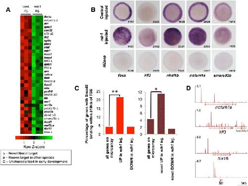 In situ hybridisation of wild type and ndr1 mRNA-injected embryos for foxa, klf3, nhsl1b, notum1a and smarcd3 at 50% epiboly showing upregulation in response to ndr1 and absence in MZoep mutant embryos that have no Nodal signaling. Animal views; dorsal to the right. Numbers on each panel indicate the number of embryos showing the phenotype depicted over the total number of embryos analysed. For foxa expression in MZoep mutants the remaining 13/36 embryos showed absent expression except for a patch on one side of the embryo. For nhsl1b and notum1a the remaining 8/26 and 5/37 embryos, respectively, showed reduced expression around the margin. (C) Comparison of all genes represented on the microarray, or ndr1-responsive genes (either up- or down-regulated) to proximal Smad2 binding; comparison was performed for both all and novel ndr1-responsive genes. Compared to all genes on the microarray or those that are down-regulated in response to ndr1, up-regulated ndr1-responsive genes (both all and novel) are significantly associated with Smad2 binding. *P =7 × 10−7; **P =1 × 10−40. (D) Examples of Smad2 binding upstream of known (tbx16 and flh) and novel targets; scale in reads per million reads.