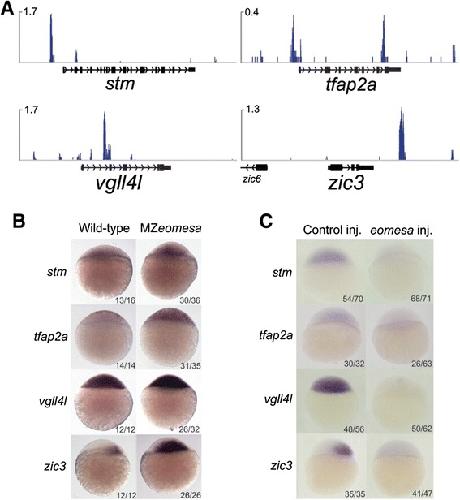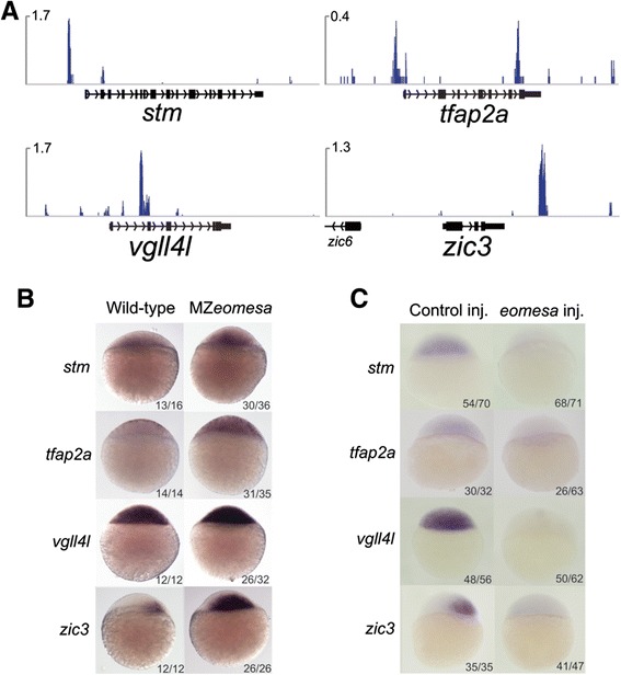 In situ hybridisation of control injected and eomesa injected embryos for stm, tfap2a, vgll4l and zic3 showing downregulation of these genes (lateral view, animal to the top). ChIP, chromatin immunoprecipitation sequencing.