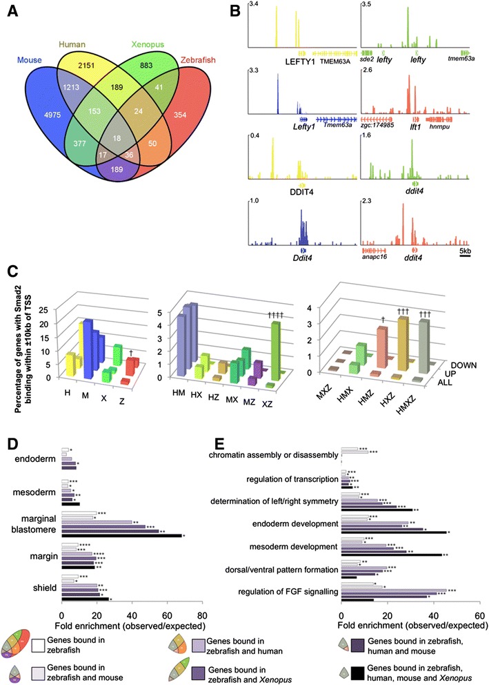 The transcriptional network directed by Nodal signalling is substantially conserved in vetebrates. (A) Venn diagram indicating the number and overlap of genes with Smad2 binding ±10 kb of TSSs in ChIP-seq datasets for each of four vertebrates. (B) Examples of genes with proximal Smad2 binding in all four species; scale in reads per million reads. Colour coded as in A. (C) Relationship between ndr1-responsive genes and proximal Smad2 binding in 1 (left), 2 (middle) or 3+ species (right). Colour coded as in A. †P ≤1 × 10−12; †††P ≤1 × 10−42; ††††P ≤1 × 10−48. (D) Fold enrichment for genes expressed at sites of Nodal activity amongst genes with proximal Smad2 binding in zebrafish, or zebrafish and other species. (E) Fold enrichment for genes involved in known Nodal-mediated processes amongst genes with proximal Smad2 binding in zebrafish, or zebrafish and other species. Key defined as gene subsets as in A. *P ≤5 × 10−2; **P ≤3 × 10−4; ***P ≤5 × 10−6; ****P ≤1 × 10−20. ChIP-seq, chromatin immunoprecipitation sequencing; TSSs, transcription start sites.