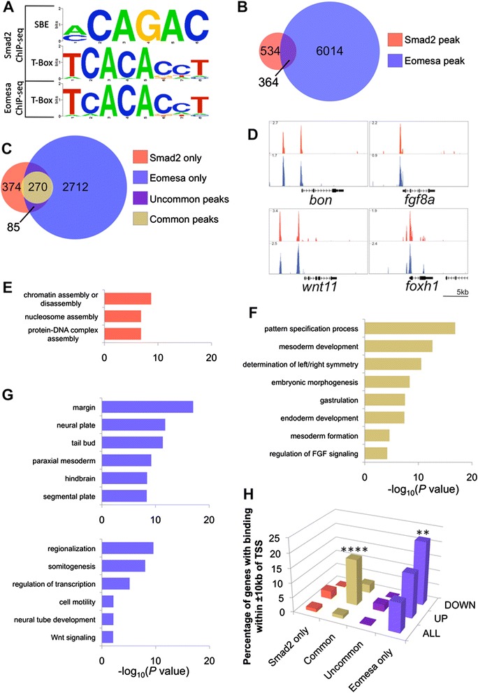 De novo motif analysis identifies the known Smad binding element (SBE) and consensus T-box binding site within Smad2 ChIP-seq peaks and Eomesa ChIP-seq peaks. (B) Venn diagram indicating the overlap between Smad2 and Eomesa ChIP-seq peaks. (C) Venn diagram of the overlap between genes with proximal Smad2 and Eomesa binding (within ±10 kb of their TSS). (D) Examples of genes with common proximal peaks of Smad2 and Eomesa binding; scale in reads per million reads. (E-G) Functional and anatomical analysis of genes showing Smad2 and/or Eomesa binding. Colour coded as in C. (H) Comparison of ndr1-responsive genes with subsets of genes with proximal Smad2 and/or Eomesa binding as defined in C. ** P ≤2 × 10−3; **** P ≤1 × 10−105. ChIP-seq, chromatin immunoprecipitation sequencing; TSS, transcription start site.