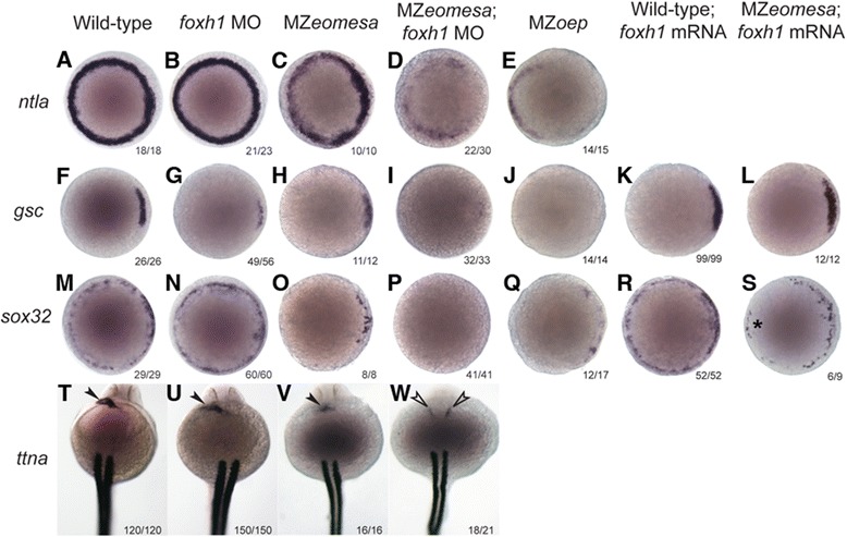(M-S) at 30% epiboly in wild-type embryos, foxh1 morphants, MZeomesa mutants, MZeomesa;foxh1 morphants, MZoep mutants, and in wild type embryos and MZeomesa mutants injected with foxh1 mRNA. Rescued expression of sox32 expression in the ventral margin of MZeomesa mutants injected with foxh1 mRNA is indicated by an asterisk. In situ hybridisation of ttna