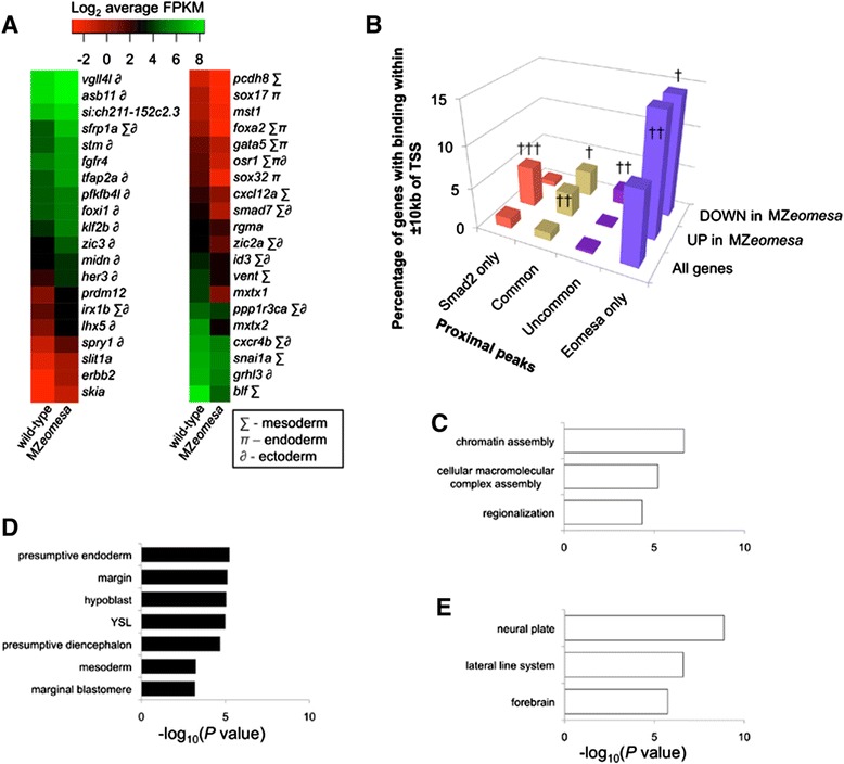Eomesa positively regulates mesendoderm and negatively regulates ectoderm markers and chromatin assembly genes. (A) Heatmap of expression differences between wild-type and MZeomesa mutants at sphere stage; π – endoderm; ∑ - mesoderm; ∂ - ectoderm. (B) Comparison of all genes, or those up- or down-regulated in MZeomesa embryos compared to wild type with genes that have Smad2 only, common, uncommon or Eomesa only binding within ±10 kb of their TSSs (colour coded as in Figure 3C). Compared to all genes, those that are up- or down-regulated in MZeomesa embryos are significantly associated with lone Eomesa binding. Genes that have common and uncommon binding are associated with down-regulated genes, whilst Smad2 only and common binding is associated with up-regulated genes in MZeomesa embryos. † P ≤2 × 10−5; †† P ≤1 × 10−7; ††† P ≤1 × 10−18. (C) Functional annotation analysis of genes upregulated in MZeomesa mutants. (D) Anatomical analysis of genes downregulated in MZeomesa mutants. (E) Anatomical analysis of genes upregulated in MZeomesa mutants. TSSs, transcription start sites.