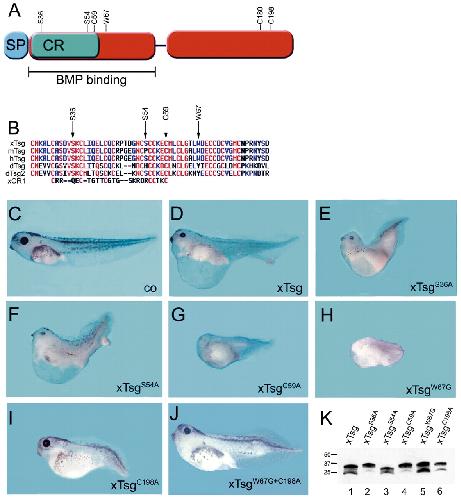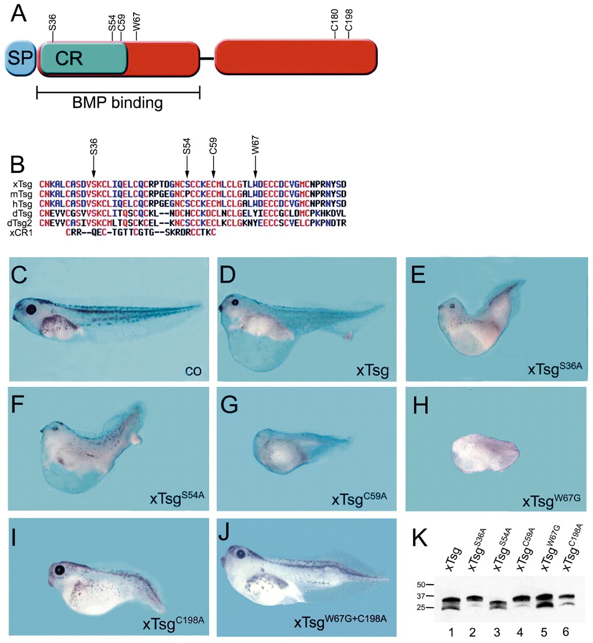 Fig. 1. The ventralizing activity of Tsg resides in its C-terminal cysteine-rich domain. (A) The Tsg mutations presented here. (B) Alignment of the N-terminal cysteine rich domain of Tsg proteins from Xenopus (xTsg), mouse (mTsg), human (hTsg), Drosophila (dTsg, dTsg2) and ChordinCR1. (C-J) Stage 42 wild-type control embryo (C) and embryos radially microinjected at the four-cell stage with a total of 2 ng xTsg mRNA (D), xTsgS36A (E), xTsgS54A (F), xTsgC59A (G), xTsgW67G (H), xTsgC198A (I), xTsgW67G+C198A (J). Each construct was analyzed in at least three independent experiments with n>30. (K) xTsg and mutant xTsg proteins secreted by dissociated animal cap cells after microinjection of 2 ng of the indicated mRNAs.