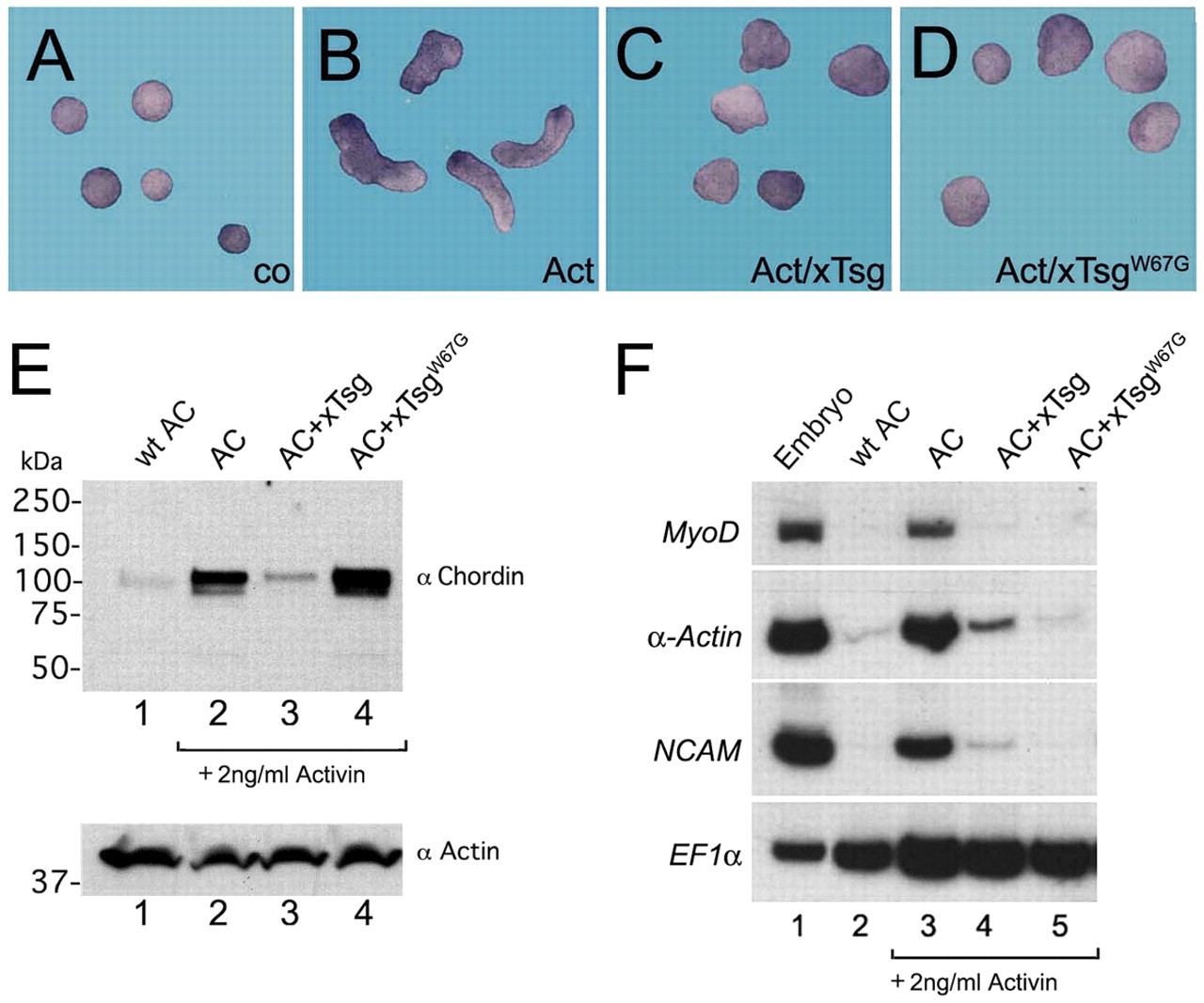 Wild-type xTsg and the hyperventralizing mutant xTsgW67G antagonize the dorsalization of mesoderm by Activin. (A-D) Animal cap explants were isolated at stage 8 and treated with 2 ng/ml Activin protein. Activin induces elongation (B). Microinjection of a total of 2 ng xTsg (C) or xTsgW67G (D) mRNA at the eight-cell stage into the animal blastomeres prevented elongation. (E) The accumulation of Activin-induced endogenous Chordin protein (lane 2) was reduced by wild-type xTsg mRNA injection (lane 3) and increased by xTsgW67G (lane 4). (F) RT-PCR analysis of animal cap explants treated with Activin after microinjection of 2 ng xTsg or xTsgW67G mRNA; both mRNAs inhibited the induction of dorsal mesodermal (MyoD, alpha-Actin) or neural (NCAM) marker genes by Activin. EF1α served as a loading control.