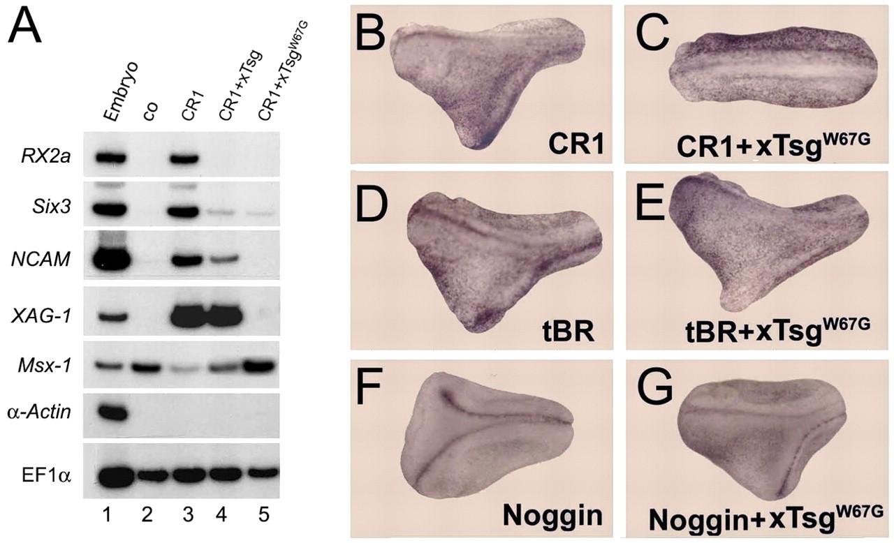 xTsgW67G inactivates an isolated CR module but not Noggin or a dominant-negative BMP receptor. (A) RT-PCR analysis of animal caps injected with the indicated mRNAs. Xenopus CR1 mRNA (80 pg total) was injected alone or together with 1 ng xTsg or xTsgW67G mRNA. (B) Microinjection of 20 pg CR1 mRNA induces secondary axes at high frequency (79%, n=79). (C) Formation of secondary axes was completely blocked by co-injection of 250 pg xTsgW67G mRNA (0%, n=39). (D) Secondary axes were efficiently induced by microinjection of 1 ng mRNA encoding a dominant-negative BMP receptor (tBR; 67%, n=49). (E) Axis-inducing activity of tBR was not affected by co-injection of 250 pg xTsgW67G (65%, n=57). (F) Injection of 0.1 pg Noggin mRNA induced secondary axes (68%, n=40). (G) The activity of Noggin was not inhibited by co-injection of 250 pg xTsgW67G mRNA (67%, n=42).