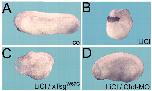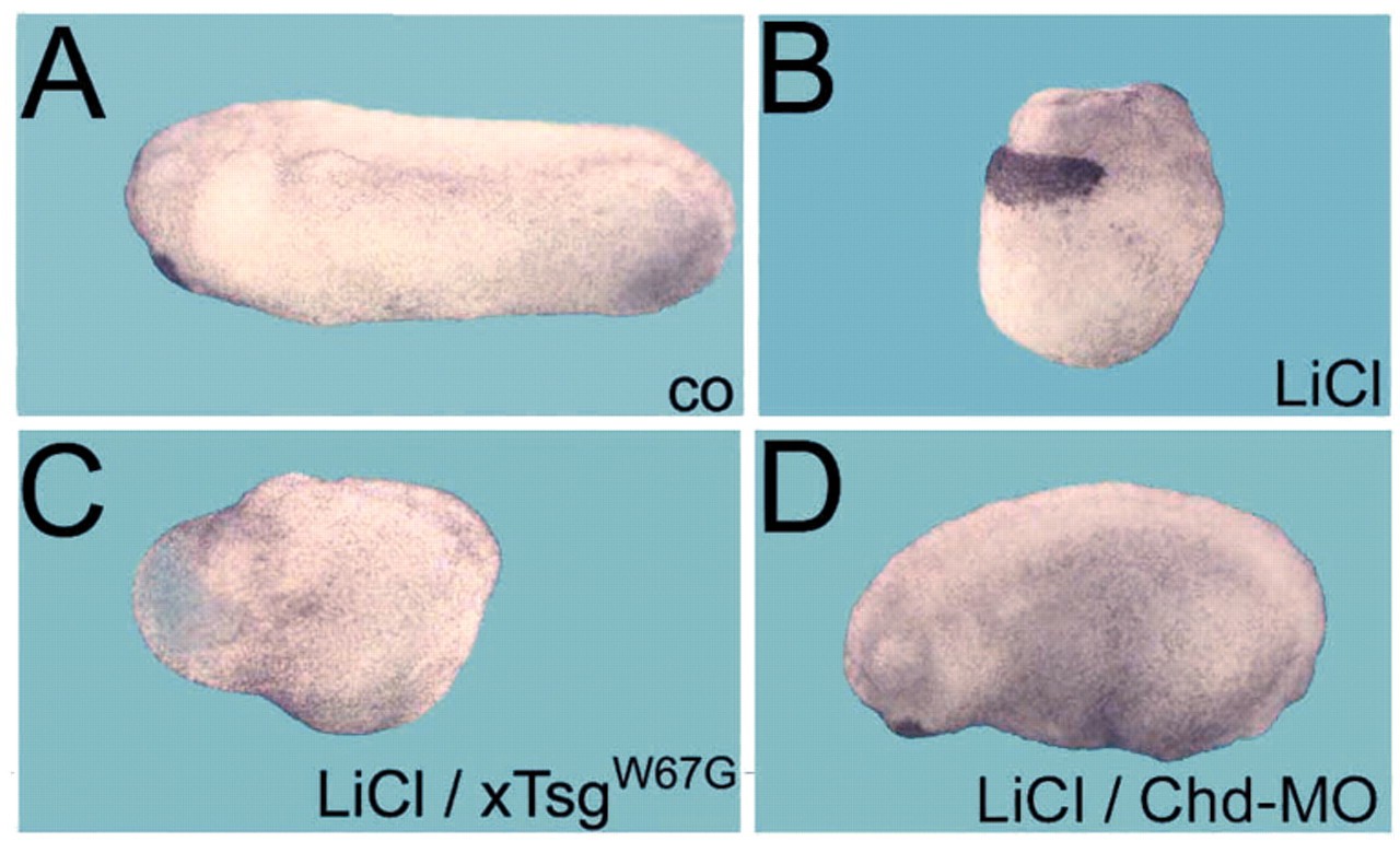 xTsgW67G overexpression prevents dorsalization by LiCl. (A) Untreated stage 30 embryo. (B) Radially dorsalized embryo obtained after LiCl treatment at the 32-cell stage (DAI=9.25, n=16). (C) Embryo microinjected into the marginal zone of each blastomere at the four cell stage with 500 pg xTsgW67G mRNA (DAI=1.1, n=11) or (D) microinjected with a total of 8 ng anti-Chordin morpholino oligos at the two-cell stage (DAI=6.4, n=36) prior to LiCl treatment at 32-cell stage. Note that xTsgW67G causes complete ventralization, which cannot be reversed by LiCl treatment.