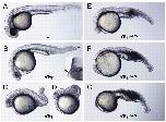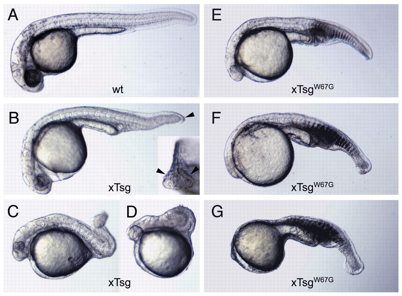 Overexpression of hyperventralizing xTsg constructs in zebrafish embryos inhibits dorsoanterior development. (A) Uninjected sibling. Wild-type zebrafish embryos were injected at the one-cell stage with 400 pg wild-type xTsg mRNA (B-D) or with 330 pg xTsgW67G mRNA (E-G). Embryos injected with wild-type xTsg mRNA in two independent experiments (n=144) displayed a range of dorsalization (as classified by Mullins et al., 1996): 13% Class 1 (not shown), 44% Class 2 (B), 17% Class 3 (C) and 24% Class 4 (D). Of the embryos displaying Class 1 or 2 dorsalizations, 51% also exhibited duplication of the terminal ventralfin (inset in B, indicated by arrowheads), suggestive of a tail ventralization in zebrafish. Of 199 embryos injected with 330 pg xTsgW67G mRNA in two independent experiments, 73% were moderately ventralized to levels comparable with chordino (E). 14% showed a phenotype more severe than chordino (F) and 3% displayed an even more ventralized phenotype (G). At higher doses (800 pg), xTsgW67G mRNA caused phenotypes stronger than chordino in 86.8% of embryos (n=91), with 18.7% of the type shown in G and 67% of the type shown in F. Note the almost complete absence of brain and trunksomites in G. Injection of 200 pg xTsgC59A mRNA into 60 embryos (not shown) also caused ventralization, with 82% appearing similar to E, and 5% resembling F.