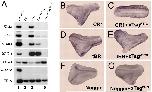 Biochemical analyses of xTsg mutant proteins. (A) RT-PCR of animal cap explants injected with 2 ng xTsg, xTsgW67G or xTsgC198A mRNA. (B) Immunoprecipitation of BMP4 bound to xTsg. Recombinant BMP4 (5 nM) was preincubated with either 20 nM xTsgW67G, xTsgC59A or wild-type xTsg protein (lanes 2, 3, 4). Immunoprecipitation was performed with a polyclonal antibody recognizing an N-terminal peptide present in the Tsg expression vector (Piccolo et al., 1999) and the immunoblot probed with anti-BMP4 or anti-Flag antibodies. (C) Tsg-Chordin complexes formed after crosslinking of 20 nM of the indicated affinity-purified xTsg proteins to 5 nM xChordin protein with DSS (disuccinimidyl suberate). xTsg proteins were visualized via the FLAG epitope. Note that xTsgW67G binds to Chordin (lane 4) and that xTsgC198A does not (lane 6). (D) Chemical crosslinking of BMP-Chordin-Tsg ternary complexes after incubation of BMP4 (5 nM, lane 1) with Chordin (5 nM, lane 2) and xTsg (20 nM, lane 3) or xTsgW67G (20 nM, lane 4) proteins. The western blot was stained with anti-BMP4 monoclonal antibody. (E) Anti-FLAG immunoblot of the same experiment shown in D, after stripping of the BMP4 antibody and incubation with an anti-FLAG antibody. (F) Crosslinking with DSS of 293T supernatants from cell cultures transfected separately with the indicated murine expression vectors and then co-cultured. Formation of a ternary BMP4-Chordin-Tsg complex led to a significant increase in BMP avidity by the monoclonal antibody (lane 4). The amounts of BMP4 in the supernatants vary, due to binding to the extracellular matrix of the cultured cells.