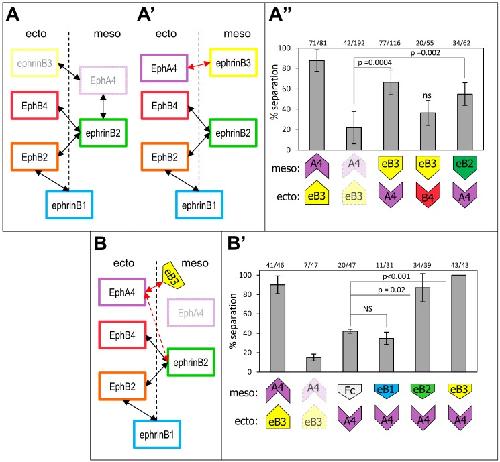 Figure 3. Ectodermâmesoderm separation relies on asymmetric expression of specific ephrin/Eph pairs across the boundary, irrespective of the direction of the asymmetry.(A, Aâ², Aâ²) Reciprocal replacement of mesodermal ephrinB3 and ectodermal EphA (mRNA injection). (A, Aâ²) Diagram describing the experiment. (A) Endogenous ephrinB3 and EphA4 were depleted in the mesoderm and ectoderm, respectively (ghost labels). (Aâ²) EphrinB3 (or B2) was then overexpressed in the ectoderm and EphA4 (or B4) in the mesoderm, thus effectively swapping the ligand and receptor (red double arrow). (Aâ²) Quantification. Swapping ephrinB3 and EphA4 efficiently restored separation. EphrinB3 could be replaced by ephrinB2, consistent with the latter also being a ligand for EphA4. However, EphA4 could not be substituted by EphB4, in agreement with EphA4 being the only receptor of ephrinB3. The weak nonsignificant rescue was likely due to a slight boost in the ephrinB2âEphB4 signal. (B, Bâ²) Similar experiment, but with the ephrin ligand substituted by direct incubation of the receiving explant with the corresponding soluble Fc fragment. EphrinB3 and EphA4 were depleted, EphA4 was overexpressed in the ectoderm, and ectoderm explants were incubated with the indicated Fc fragments. Overexpression of EphA4 led to a partial rescue of separation (control Fc), likely by activating ephrinB2âEphA4 signaling across the boundary (red dashed double arrow). Incubation with ephrinB3-Fc fully rescued separation. EphrinB2-Fc but not the ephrinB1-Fc fragment could also rescue, in agreement with the selectivity of EphA4. |