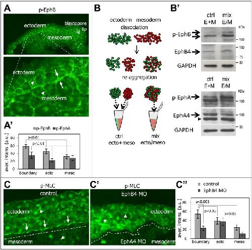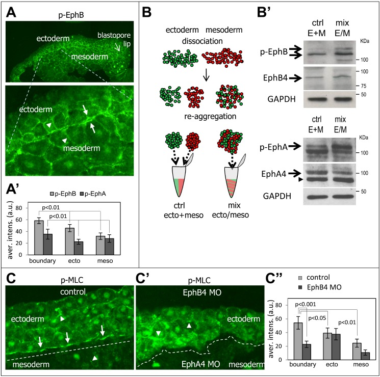 Figure 4. Increased Eph receptor and myosin activation at the ectoderm–mesoderm contacts.(A) Detection of phospho-EphB by immunofluorescence of a sagittal section from wild-type early gastrula embryo. The upper panel shows a general view of the dorsal region, and the lower panel an enlarged view of the ectoderm–mesoderm boundary. (A′) Quantification of relative signal intensity (arbitrary units) measured for phospho-EphB and phospho-EphA at cell–cell contacts along the boundary and inside each tissue. Averages from five embryos for phospho-EphA and nine embryos for phospho-EphB. p values = Student t test. (B, B′) Biochemical comparison of Eph phosphorylation levels between homogenous tissue aggregates and mixed ectoderm mesoderm aggregates. (B) Schematic description of the experiment. Dissociated ectoderm and mesoderm cells were mixed and left to reaggregate for 30 min, which produced a maximal number of “heterotypic” ectoderm–mesoderm contacts mimicking contacts at the boundary. Homogenates from these mixed aggregates (E/M mix) were compared to the same amount of cells assembled into separate ectoderm and mesoderm aggregates, thus forming only “homotypic” contacts, and combined during homogeneization (E+M ctrl). (B′) Western blots were probed for total and phospho-EphA, phospho-EphB, total EphA, and EphB. Mixed aggregates showed a reproducibly higher level of p-Eph signals (arrows), which indicates stronger activation at boundary contacts. Arrowheads, nonspecific bands. GAPDH was used as loading control. (C, C′, C″) Selective accumulation of p-MLC along the ectoderm–mesoderm boundary and its dependence on ephrin/Eph signaling. Ectoderm and mesoderm explants were combined, incubated for 1 h, and fixed. Cryosections were immunostained for p-MLC. (C) Normal boundary (underlined by a dashed line) between wild-type tissues. p-MLC levels are higher in the ectoderm than the mesoderm, but highest along the boundary (arrows). Arrowheads point to p-MLC signal along membranes within each tissue. (C′) Loss of p-MLC staining at the tissue interface upon Eph depletion: EphB4-depleted ectoderm and EphA4-depleted mesoderm showed largely unchanged tissue staining, but p-MLC was prominently missing from the fused interface, delineated by the dashed line. (C″) Quantification of p-MLC signal intensity at cell–cell contacts at the boundary and inside the tissues in control and Eph morpholino conditions. Average from nine embryos. p values = Student t test. |