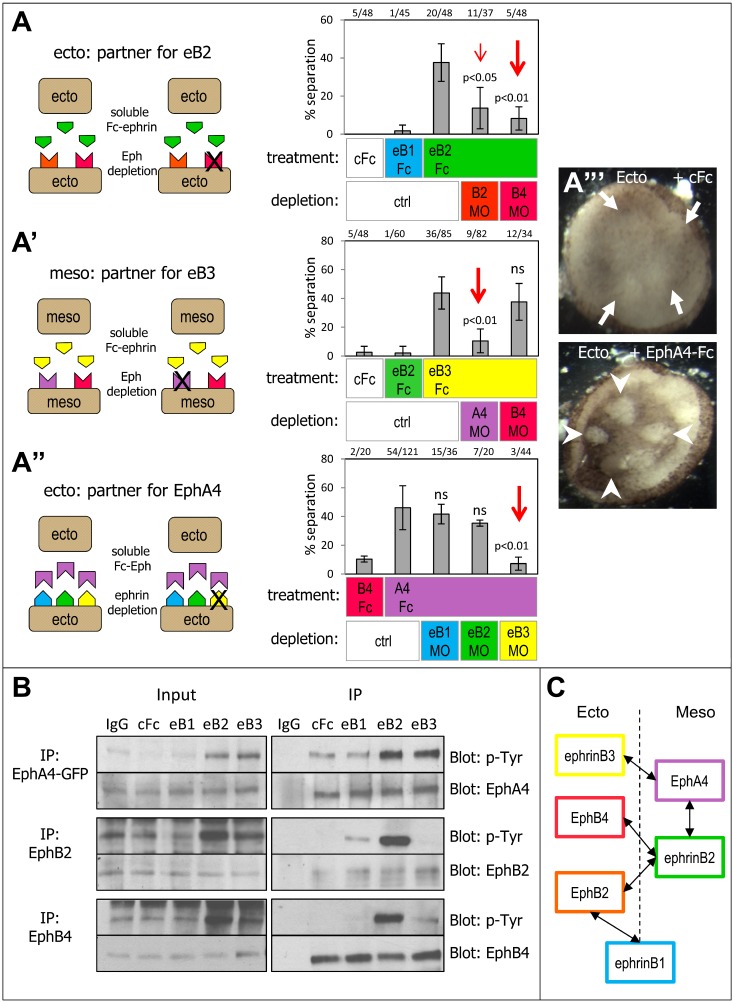 Figure 2. Characterization of ephrinâEph specificity.(A) Identification of functional cognate receptors. The in vitro separation assay was performed using two explants from the same tissue (ectodermâectoderm or mesodermâmesoderm). Under normal conditions these explants mix completely. Separation could be induced when these explants were exposed to soluble Fc fragments corresponding to ephrins or Ephs normally enriched in the other tissue (see Figure 1C), thus mimicking the endogenous asymmetric ephrin/Eph expression. The endogenous functional partners were then identified by depleting single candidate ephrins/Ephs in the receiving explant and determining which of them was required for ectopic separation. Note that in this set of experiments, Fc fragments were present during the assay, ensuring that both explants were continuously exposed. Separation can also be induced by treating only one explant, although the penetrance is lower [4]. (A) Separation of ectoderm explants was induced by soluble Fc fragments corresponding to âmesoderm-specificâ ephrinB2, but not ephrinB1, already endogenously enriched in the ectoderm. EphrinB2-Fcâinduced separation was strongly inhibited by EphB4MO and more weakly by EphB2MO. (Aâ²) Mesoderm aggregates were tested on large mesoderm layers artificially produced in the animal pole of the embryo (see Materials and Methods). Separation was induced by Fc fragments of âectoderm-specificâ ephrinB3, but not ephrinB2. Ephrin3-induced separation was reversed by EphA4MO but not by EphB4MO (red arrow). (Aâ²) Ectopic separation between ectoderm explants was induced specifically by âmesodermalâ EphA4 but not by âectodermalâ EphB4. Separation was inhibited only by ephrinB3MO (red arrow). (Aâ²â²) Examples of mixing of ectoderm explants incubated with control Fc (arrows) and of separation of ectoderm explants treated with EphA4-Fc (arrowheads). (B) Biochemical analysis of differential activation of Eph receptors by ephrin ligands. Ectoderm explants were treated with 40 nM ephrinB1, B2, B3 Fc fragments or with control anti-Fc antibodies for 1 h, and then lysed. Endogenous EphB2 and EphB4, and EphA4 were immunoprecipitated and analyzed by immunoblotting for phospho-tyrosine and for total Eph levels. In the case of EphA4, which is only expressed at low levels in the ectoderm, EphA4-GFP was ectopically expressed. EphA4 was strongly phosphorylated in response to both ephrinB2 and ephrinB3, but not ephrinB1, which gave levels similar to negative controls. EphB2 responded strongly to ephrinB2, and only weakly to ephrinB1. EphB4 was highly phosphorylated in response to ephrinB2, whereas activation by ephrinB1 or ephrinB3 was negligible. IgG, control immunoprecipitation with nonimmune IgGs. (C) Summary of the main ectoderm and mesoderm-enriched ephrins/Ephs and of the preferred functional interactions. |