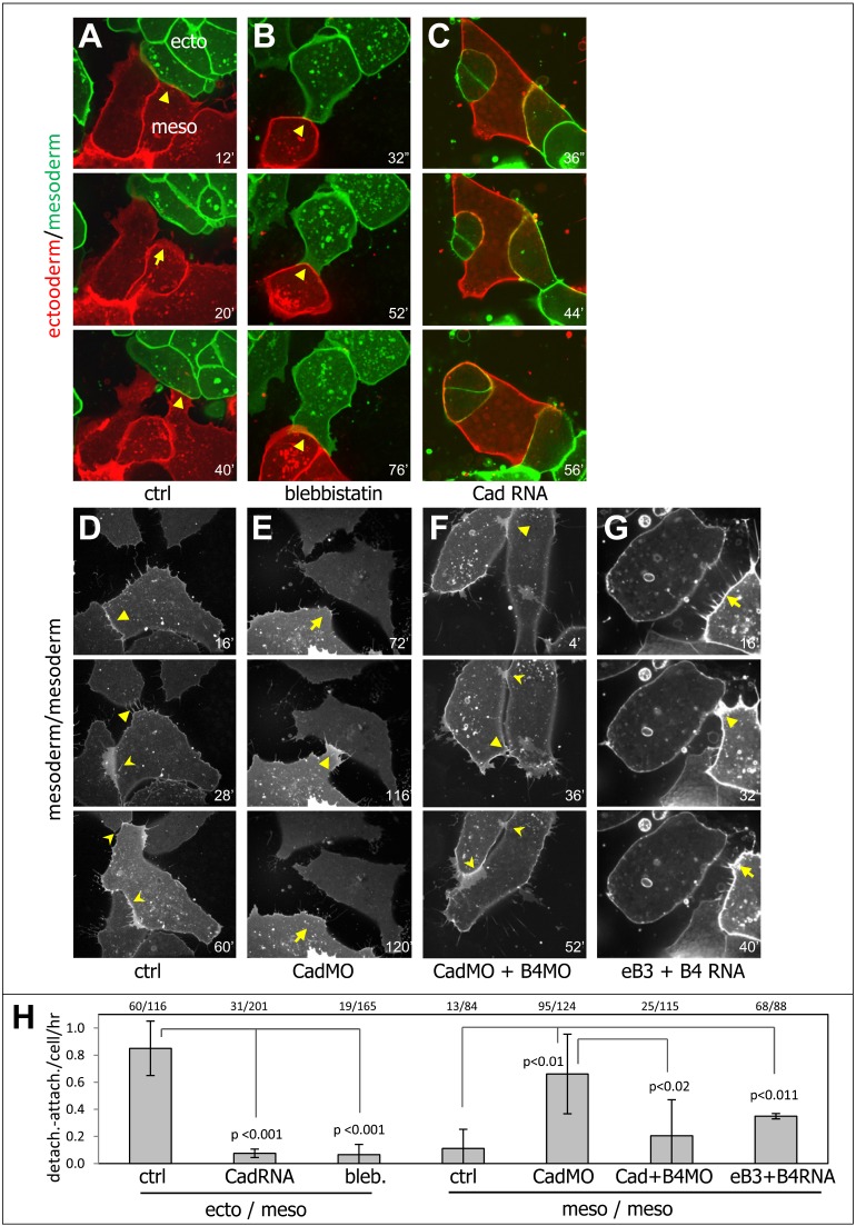 Figure 5. Tissue separation is controlled by a balance between ephrin/Eph-mediated repulsion and cadherin adhesion.(A–C) Ectoderm–mesoderm repulsion requires myosin activity and is antagonized by cadherin adhesion. Selected frames from time lapse confocal movies (Materials and Methods) showing dynamics of cell–cell contacts between single embryonic cells. Cells dissociated from ectoderm and mesoderm tissues were plated on glass coated with low amounts of fibronectin (see Materials and Methods). Ectoderm cells expressed membrane-GFP, and mesoderm cells membrane-Cherry. (A) Wild-type ectoderm and mesoderm cells stably attached to cells from the same tissue, but contacts between ectoderm and mesoderm cells exhibited cycles of attachments (arrowheads) and detachments (arrows) recapitulating the separation behavior observed at the boundary between the two tissues. (B) After treatment with 100 µM blebbistatin, most ectoderm mesoderm contacts remained stable. (C) C-cadherin overexpression in both ectoderm and mesoderm strongly decreased detachments. Note that mesoderm cells tended then to surround ectoderm cells. (D–G) Evidence for subthreshold levels of Ephrin/Eph-mediated repulsive signals between mesoderm cells. (D) Mesoderm cells (here control MO-injected) established stable contacts (arrowheads) that were maintained (concave arrowheads) throughout the duration of the recording (1 h). (E) Cadherin-depleted mesoderm cells (cadherin MO) showed frequent figures of redetachments (arrows), indicating the existence of repulsive signals. (F) Stable contacts between cadherin-depleted mesoderm cells were rescued by simultaneous Eph depletion, demonstrating that the repulsion observed between mesoderm cells was due to ephrin–Eph signaling. (G) Detachment between mesoderm cells could be induced by increased ephrin–Eph-mediated repulsion through ectopic expression of ephrinB3 and EphB4, the “preferred” ectoderm partners for “mesodermal” EphA4 and ephrinB2. Frame numbers of the corresponding movies are indicated. (H) Quantification of the rate of attachment/detachment per cell per hour. Numbers indicate number of events per number of cells analyzed. |