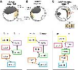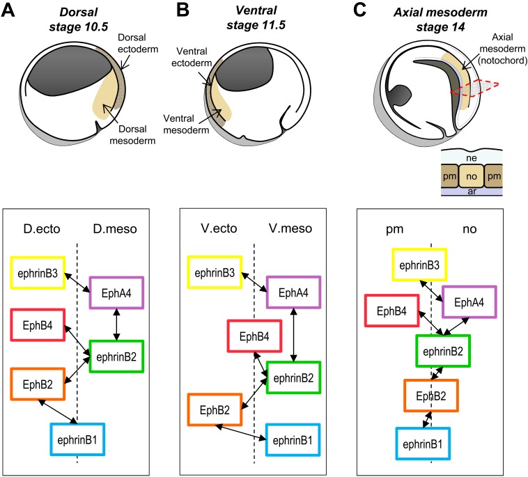 Figure 6. Schematic representation of the three boundaries forming during Xenopus gastrulation and simplified diagrams of the preferential ephrin–Eph pairs.(A) Dorsal ectoderm–mesoderm boundary. (B) Ventral ectoderm–mesoderm boundary. (C) Notochord–paraxial mesoderm boundary. The top drawings represent sagittal sections of the corresponding stages and highlight the two tissues forming the corresponding boundary. At stage 14, the boundaries between the notochord (no) and the paraxial mesoderm (pm) form perpendicular to the plane of the section. Cross-section is shown in insert. ar, archenteron roof; ne, neuroderm. In the lower diagrams, the position of the boxes representing each molecule symbolizes its general distribution: A box placed on one side of the boundary corresponds to strong asymmetric distribution. Weakly asymmetric or homogenous distributed molecules are drawn overlapping the boundary. The double arrows link the functional pairs. The patterns at the dorsal and the ventral boundaries are similar, with two prominent differences: EphrinB1 shifts from equal in the two dorsal tissues to more mesodermal in the ventral side. EphB4, on the contrary, shifts from mainly ectodermal to equally distributed. At the end of gastrulation, the dorsal mesoderm experiences significant changes: Compared to the earlier dorsal mesoderm, the notochord (no) keeps EphA4 and ephrinB2, but the paraxial mesoderm (pm) loses EphA4 and acquires ephrinB3 and EphB4, which were until then typically ectodermal. Note that the major asymmetries concern EphA4 and B4; the other components are only slightly enriched in one or the other sides of the boundary. |