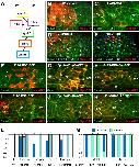 Figure 7. Partially complementarily expressed ephrins and Ephs control notochord–paraxial mesoderm separation.(A) Summary of ephrin and Eph expression and of the functional pairs (double arrows) in the dorsal mesoderm at stage 14 (see Figure S1B). (B–M) Manipulations were targeted to a restricted region of the dorsal mesoderm. Embryos were fixed at stage 14, and the dorsal structure was analyzed on sections. Injected cells were detected by the tracer Myc-GFP (red). Only the strongest signal is visible on these images but is sufficient to indicate the position of the injected area. Membranes were labeled with an anticadherin antibody (green). In (D) and (E), FoxA4-positive nuclei appear in green–cyan. FoxA4 is used as the notochord marker. (B) Control. Normal boundaries (highlighted by dashed lines) were characterized by a smooth alignment of the notochord and paraxial mesoderm cells. (C) Strong boundary disruption in an ephrinB2 MO-injected embryo. The position of the left boundary can still be located (arrowheads), but the alignment is jagged (arrowhead). On the right side, the two tissues are continuous, without a detectable boundary. Arrows point to the approximate limit of the notochord. (D and E) The boundary is effectively disrupted by ephrinB3 MO targeted to the paraxial mesoderm (arrows in D), but not to the notochord (E). (F–H) EphA4 MO injection in the notochord, the tissue fused with the paraxial mesoderm (F, arrows). A boundary can be rescued by the coinjection of mRNA coding for the AB Eph chimera (G, dashed lines) but not by the BA chimera (H, boundaries lack on both sides, arrows). Thus, the extracellular domain of EphA4 is necessary and sufficient for its function in the notochord. (I) Inhibition of separation by EphB4 MO targeted to the paraxial mesoderm. Left boundary is missing (arrows). (J) Rescue by the BA chimera. The injection was targeted to the right boundary. (K) The AB chimera fails to rescue. The injection was targeted to the left side (arrows). The right boundary is intact (dashed line). (L) Quantification of boundary disruption by ephrin/Eph depletion. Individual boundaries were scored as follows: 1, intact boundary; 0.5, partially disrupted boundary (rare cases); 0, fully disrupted boundary. The first column (t) compiles data of all embryos, (no) and (pm) the number of boundaries where injection was mainly targeted to the notochord or to the paraxial mesoderm. Numbers on top are numbers of embryos (2–6 independent experiments). EphrinB2, which can interact with both EphA in the notochord and EphB4 in the paraxial mesoderm, was required in both tissues. EphrinB3 and EphB4 depletion strongly disturbed the boundary when targeted to the paraxial mesoderm, but had no effect in the notochord. The opposite was observed for EphA4, consistent with the expression patterns and the selective interactions. (M) Quantification of rescues by wild type and chimera forms of EphA4 and EphB4. In all cases, complete rescue was obtained with the corresponding wild-type proteins and with the chimera containing the correct extracellular domain. The nature of the intracellular domain was indifferent. Numbers on top indicate total number of boundaries in each category. |