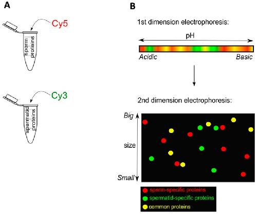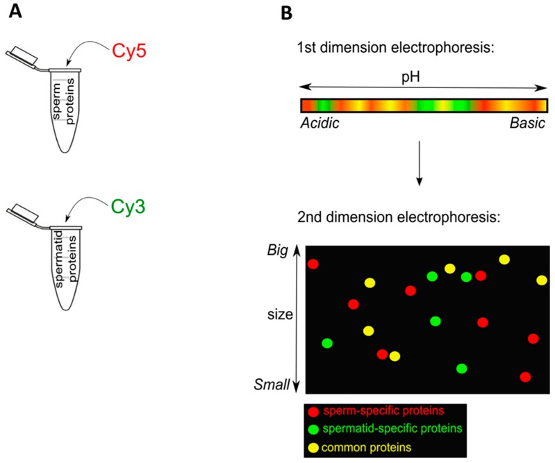Figure 1. Experimental design for 2-D Fluorescence Difference Gel Electrophoresis (2D-DIGE) analysis. (A) The same quantity of proteins isolated from sperm or spermatids was labelled with Cy5 (red) or Cy3 (green) dye; (B) After labelling, proteins were mixed and separated in the first dimension electrophoresis in the pH range, according to isoelectric points of proteins. Subsequently, the proteins were run in the second dimension electrophoresis, according to the molecular weight of proteins. These two runs allowed separation of proteins into spots of three colours: in this example the red spots were sperm-specific; the green ones spermatid-specific and the yellow ones were proteins present in both cell types.